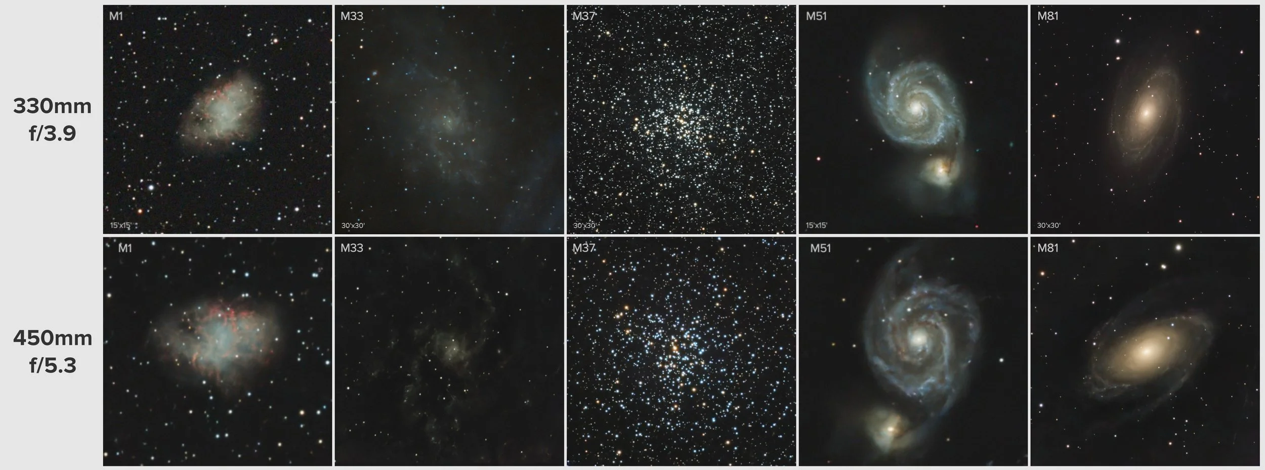 A comparison of five targets imaged using the FSQ-85 with reducer (330mm @ f/3.9) and with flattener (450mm @ f/5.3). The latter gives better resolution, but the difference is not huge, and the slower version had more difficulties with a faint target like M33.