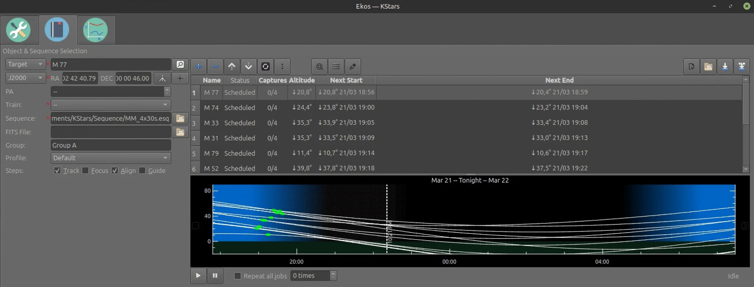 To keep the pace during each of the imaging groups, selecting the next target straight after completing the previous is crucial. Rather than doing this manually, this process was automated using the scheduler in KStars. For each of the groups a schedule was built beforehand. So during the evening I had to load a new schedule for the start of each group.