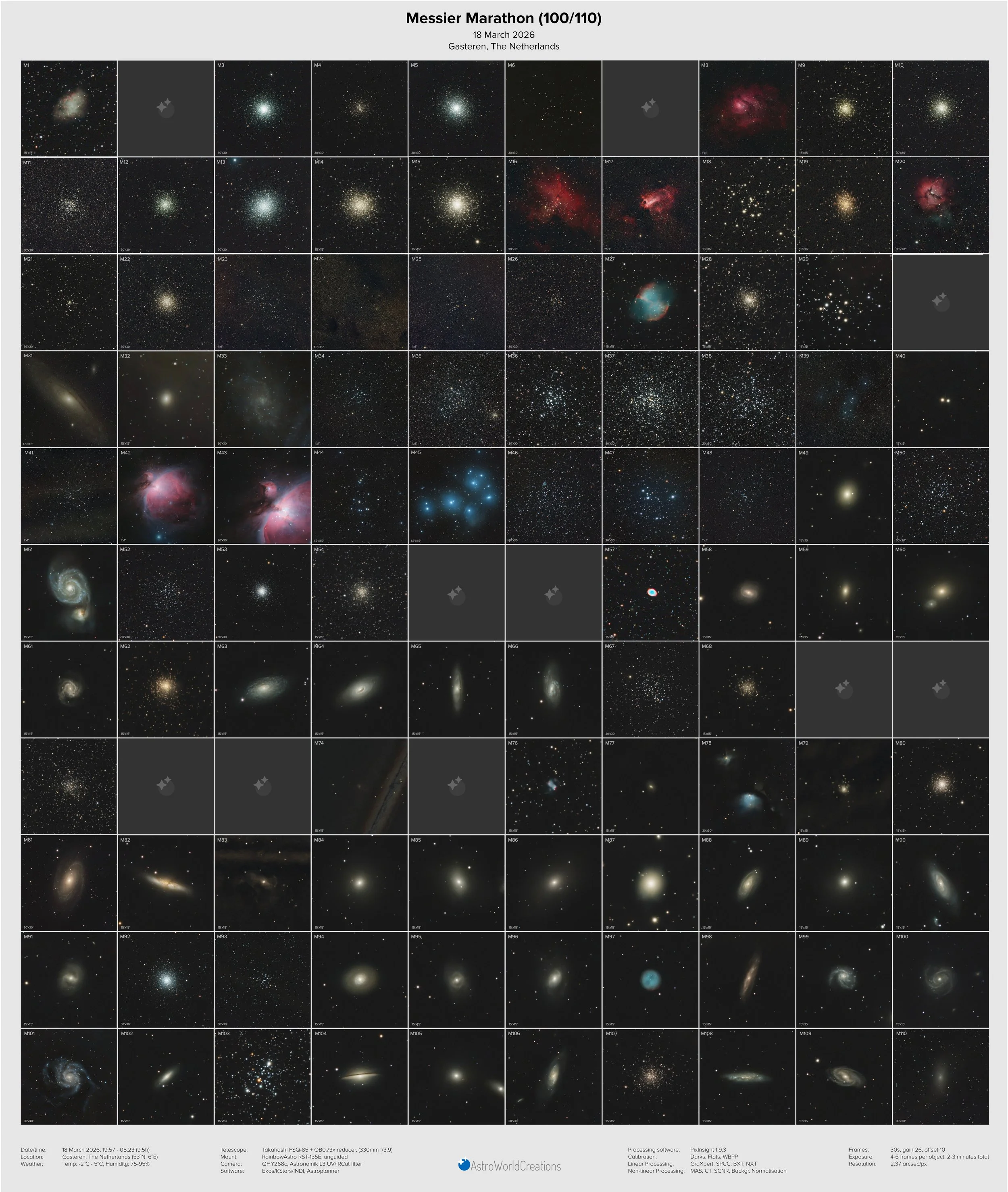 Observing all 110 Messier objects in one night is called a ‘Messier Marathon’. That is quite a challenge, and depending on the latitude of the observer the maximum number of objects may be even a bit lower than that. Photographing all 110 Messier objects is easier on one hand, with automated slews to target, but more challenging because you have to get a decent photo for each target in less than a few minutes. This blog describes an imaging attempt to the Messier Marathon as it was performed on 18 March 2026.