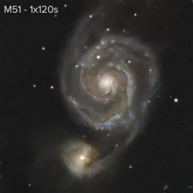 Targeting multiple short exposures was a technique ‘borrowed’ from EAA. It is used in robotic telescopes such as Dwarf or Seestar and implemented in certain software solutions like Stellarmate/KStars and ASIAir. During a second evening I took some 120s exposures, just for comparison