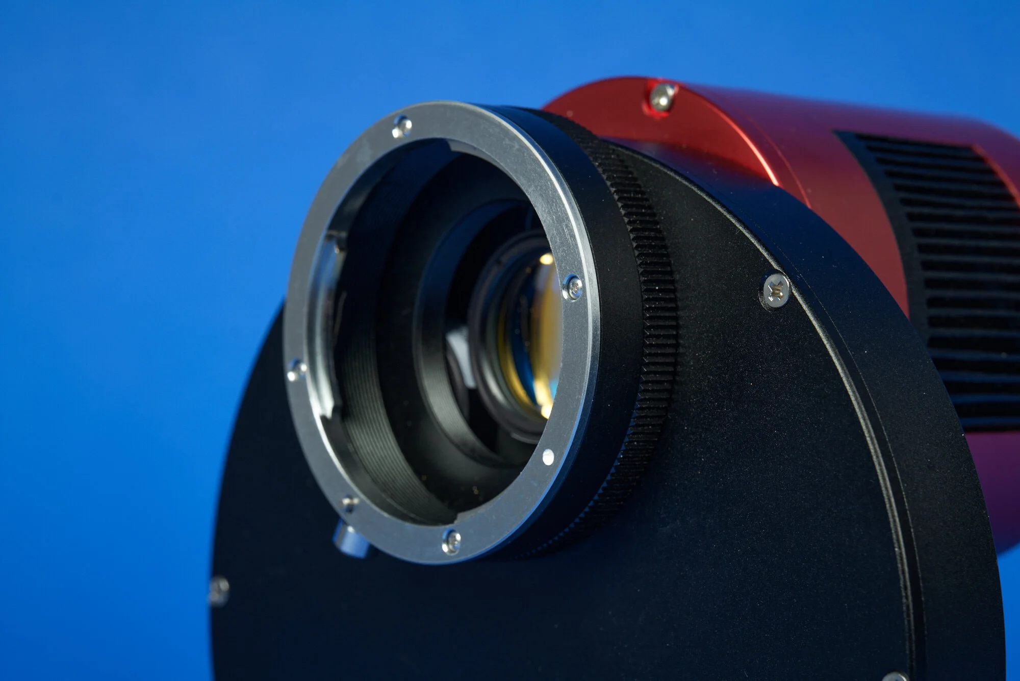 The C3 camera system allows for quite some customisations. Differently sized (semi)integrated filterwheels, different cooling options, optional ethernet connectivity, etc. One purely cosmetic option is the choice of color for the camera center plate. Default is black, but you can opt for a blue or red option. Here blue is chosen to match the CDK14 telescope it will be attached to.