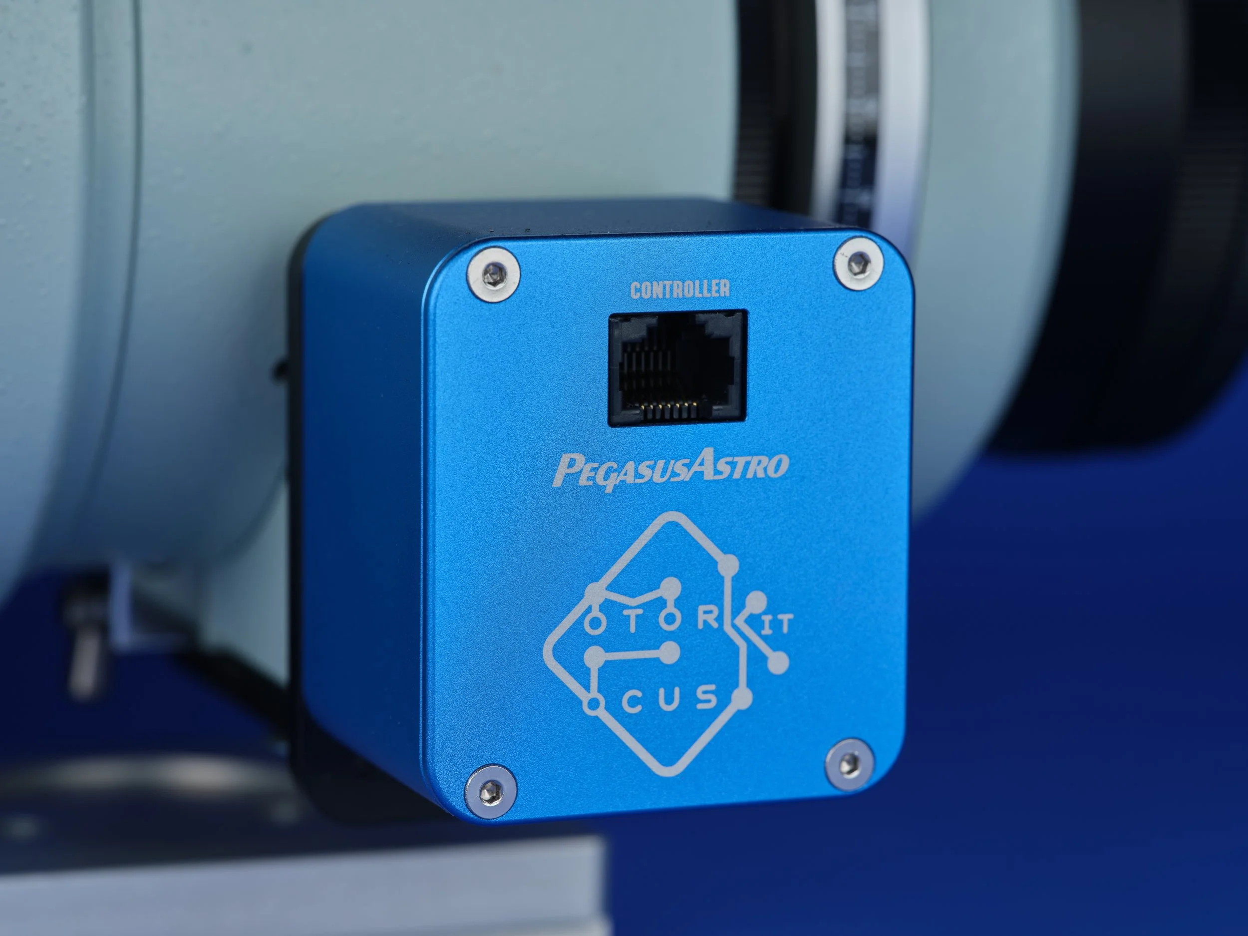 Autofocusing is done using the Pegasus Astro Motor Focus Kit v2. This device only contains a focus motor. The focus controller is built into the Ultimate PowerBox. The benefit of this combination is that only one ethernet-style cable is enough to provide power and data to the focus motor.