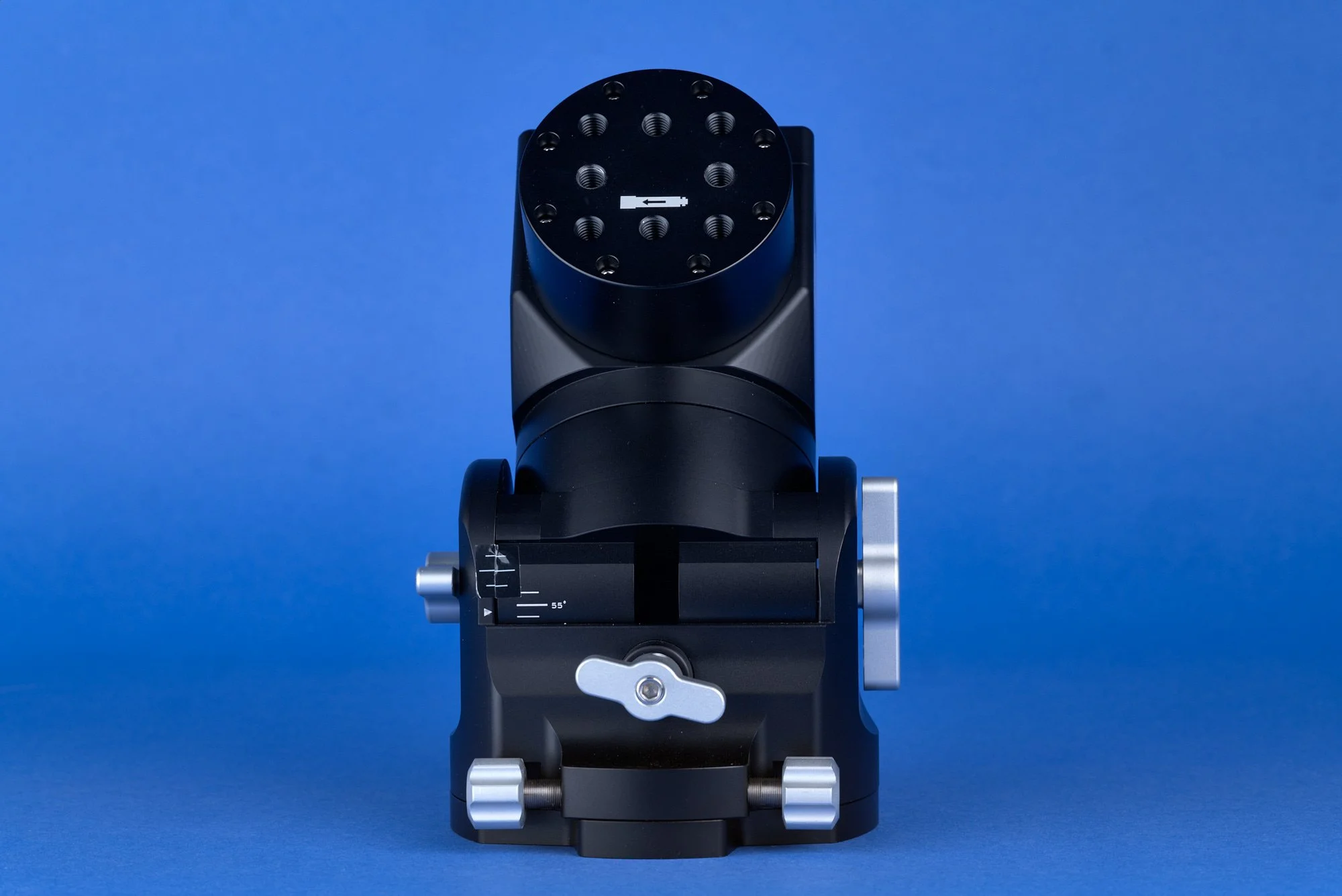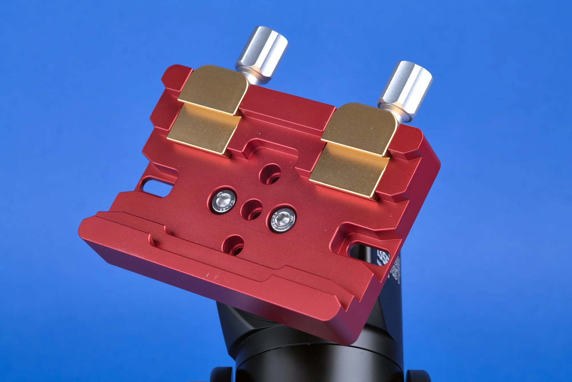 When using the mount in combination with a regular photo camera, a typical connection plate is of the Arca Swiss type. ADM has an Arca Swiss type saddle that can be screwed onto this mount. On the mounting plate there is a total of eight holes, so the saddle can also be placed perpendicular to the regular telescope pointing position. Depending on the camera/lens connection this may be important.