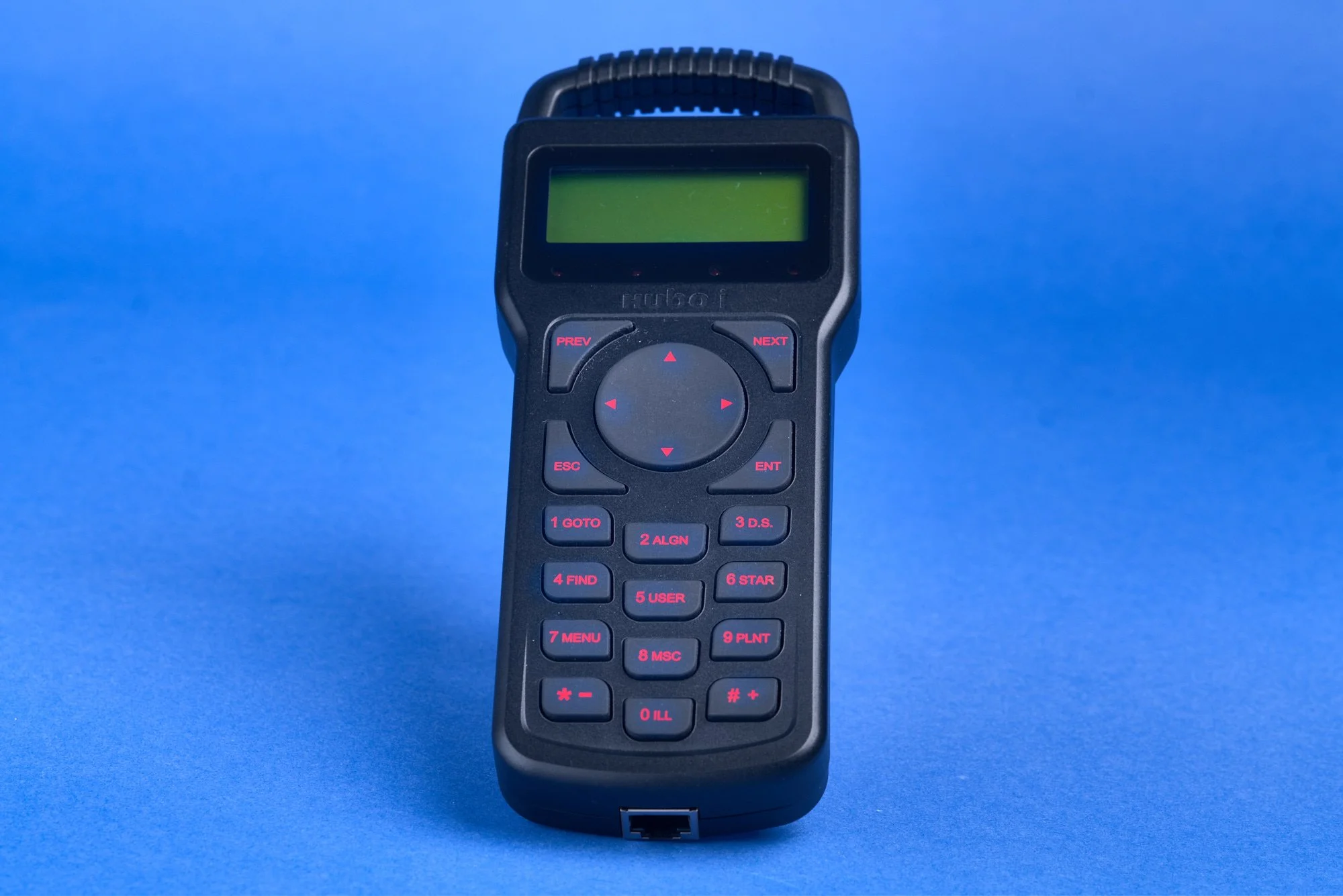 The hand controller (HUBO-I) plugs in through an ethernet-cable. The menu-system is not very intuitive, but with a bit of practise you can find all relevant options. The most important function is the homing function, a long press on “0". With this function the mount calibrates its position and parks the mount in a fixed home position. Each time when turning off/on the mount, this homing needs to be done, otherwise the mount can show some weird behaviour and erratic movements.