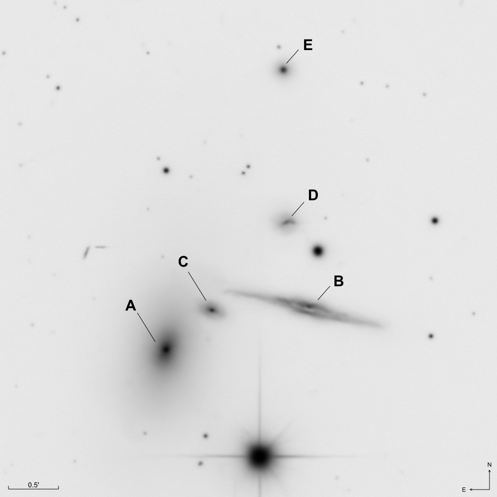 HCG37 is a compact quintet located in the constellation Cancer. The five galaxies have similar distances to Earth, in the range of approximately 300 million light-years. The brightest galaxy (a) is also known as NGC 2783. It has an angular size of 2.63’ x 1.58’ and an apparent magnitude of 13.9. Perhaps the most striking galaxy is the second brightest (b). An edge-on spiral galaxy with visible dust lane. The bright star at the bottom is TYC1957-223-1, a 9th magnitude star at a distance of 2951 light-years with no relationship to the galaxy group. Details of all five galaxies are listed in the table below.