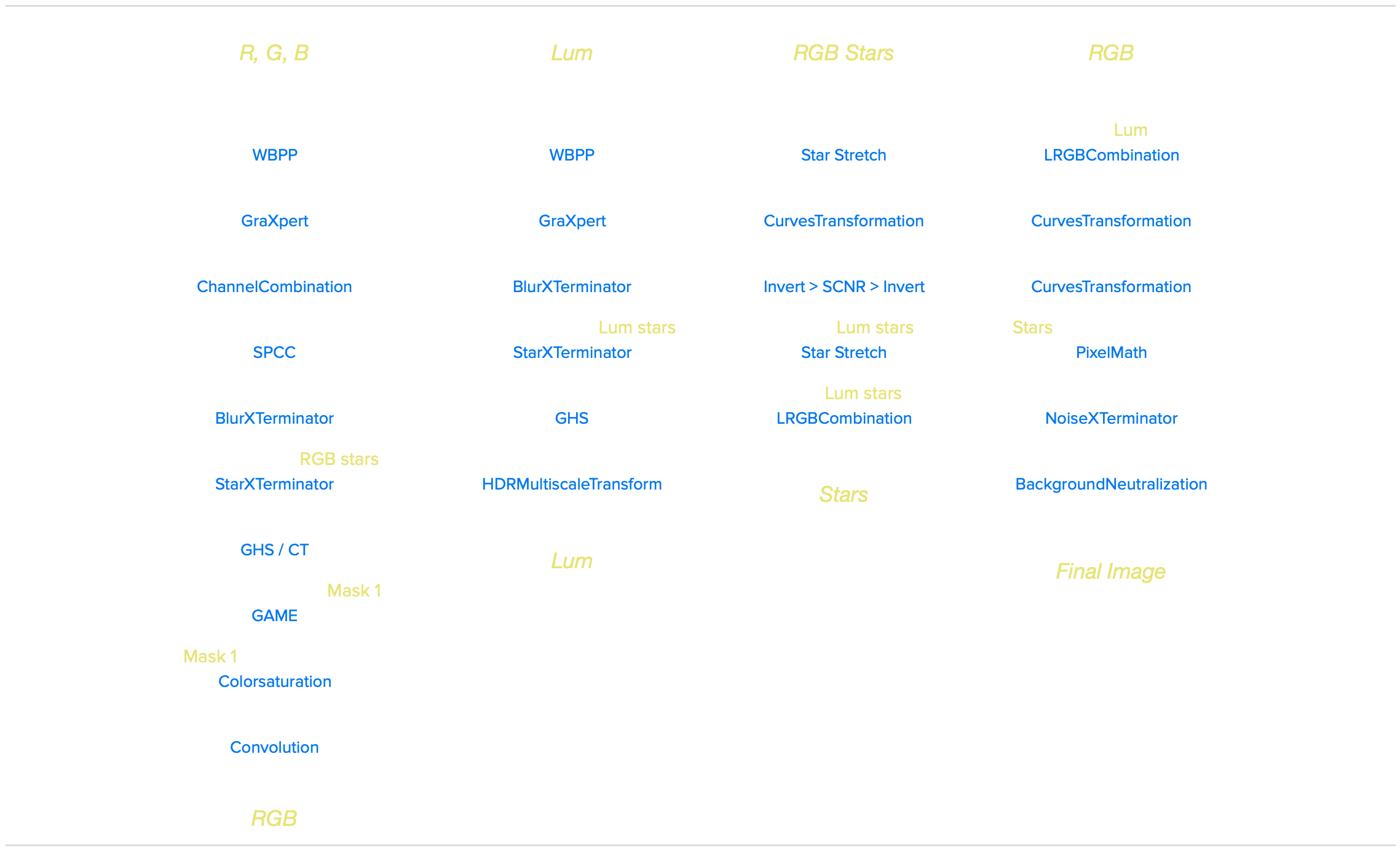 All processing was done in Pixsinsight unless stated otherwise. Default features were enhanced using scripts and tools from RC-Astro, SetiAstro, GraXpert, CosmicPhotons and others. Images were calibrated using 50 Darks, 50 Flats, and 50 Flat-Darks, registered and integrated using WeightedBatchPreProcessing (WBPP). The processing workflow diagram below outlines the steps taken to create the final image.