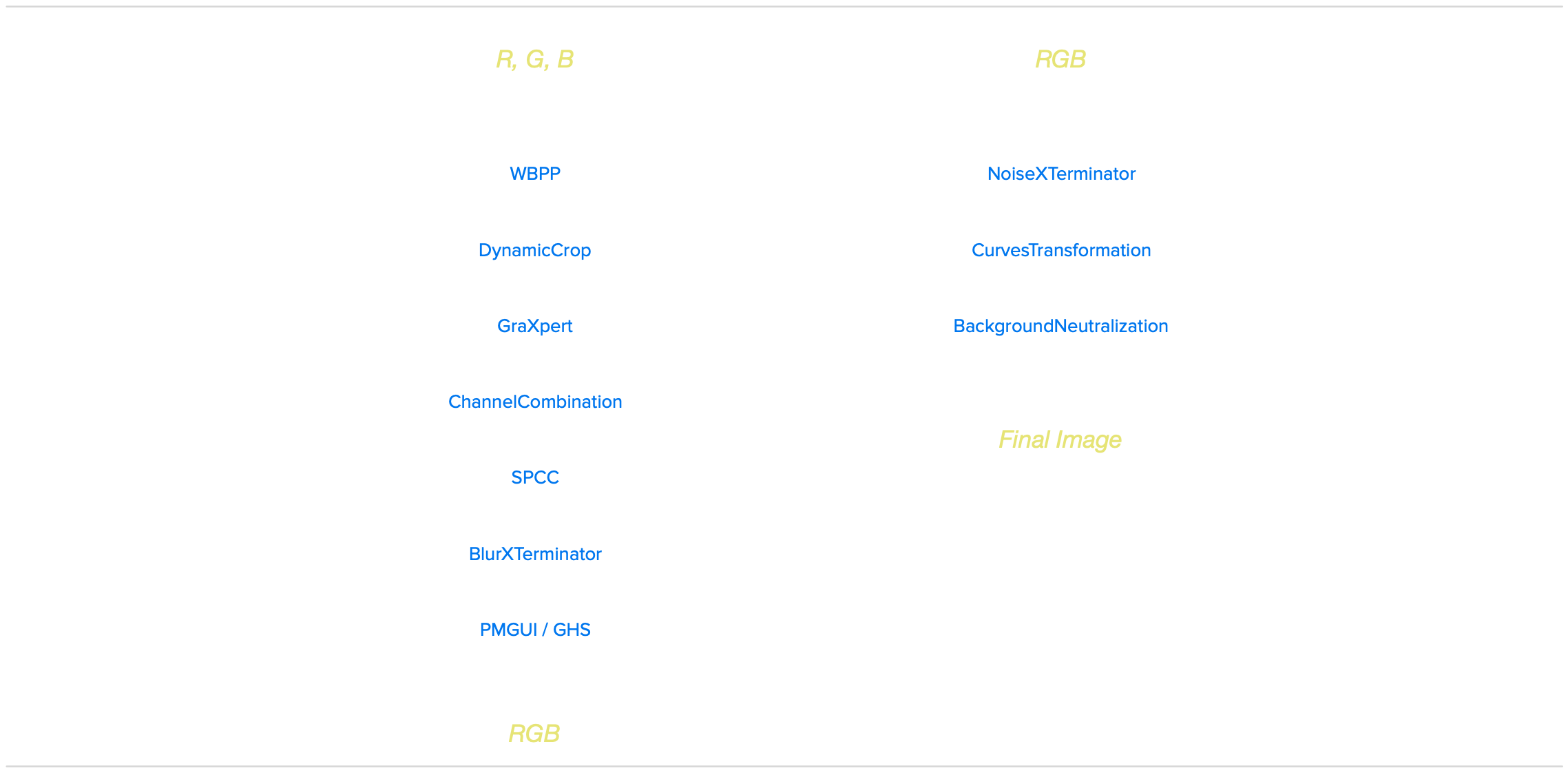 All processing was done in Pixsinsight unless stated otherwise. Default features were enhanced using scripts and tools from RC-Astro, SetiAstro, GraXpert, CosmicPhotons and others. Images were calibrated using 50 Darks, 50 Flats, and 50 Flat-Darks, registered and integrated using WeightedBatchPreProcessing (WBPP). The processing workflow diagram below outlines the steps taken to create the final image.