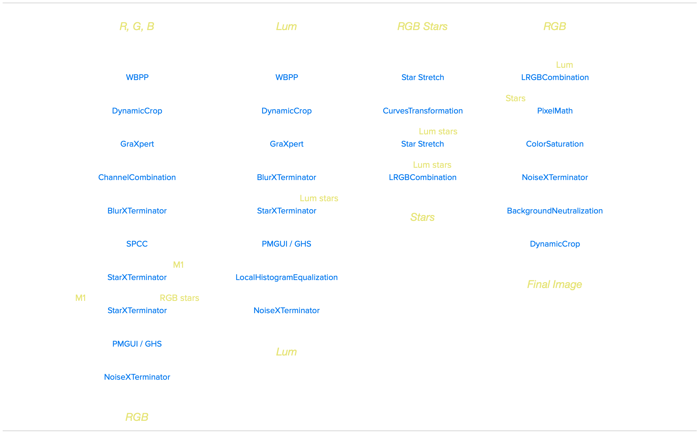 All processing was done in Pixsinsight unless stated otherwise. Default features were enhanced using scripts and tools from RC-Astro, SetiAstro, GraXpert, CosmicPhotons and others. Images were calibrated using 50 Darks, 50 Flats, and 50 Flat-Darks, registered and integrated using WeightedBatchPreProcessing (WBPP). The processing workflow diagram below outlines the steps taken to create the final image.