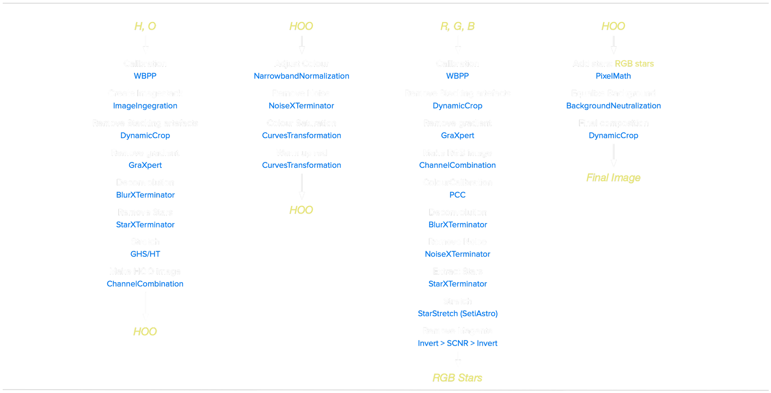 All images were calibrated using Darks (50), Flats (50) and Flat-Darks (50), registered and integrated using the WeightedBatchPreProcessing (WBPP) in PixInsight. All further processing was done in PixInsight, including the use of scripts and tools developed by RC-Astro, SetiAstro, GraXpert, and others. For a step-by-step description of the processing techniques applied, see process flow below.