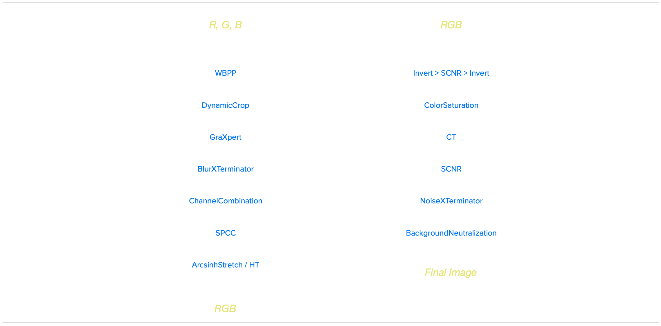 All processing was done in Pixsinsight unless stated otherwise. Default features were enhanced using scripts and tools from RC-Astro, SetiAstro, GraXpert, CosmicPhotons and others. Images were calibrated using 50 Darks, 50 Flats, and 50 Flat-Darks, registered and integrated using WeightedBatchPreProcessing (WBPP). The processing workflow diagram below outlines the steps taken to create the final image.