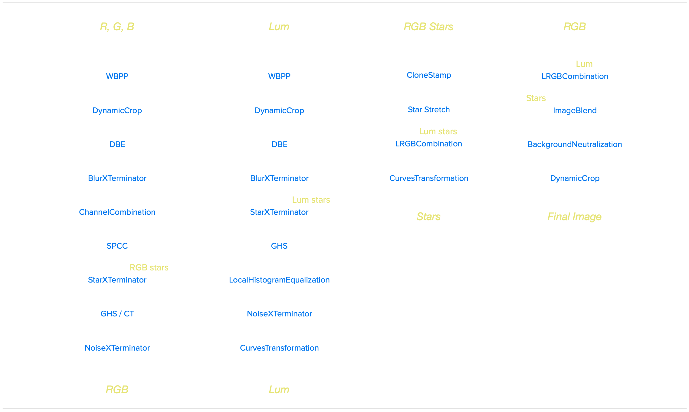 All processing was done in Pixsinsight unless stated otherwise. Default features were enhanced using scripts and tools from RC-Astro, SetiAstro, GraXpert, CosmicPhotons and others. Images were calibrated using 50 Darks, 50 Flats, and 50 Flat-Darks, registered and integrated using WeightedBatchPreProcessing (WBPP). The processing workflow diagram below outlines the steps taken to create the final image.