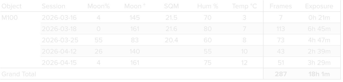 Data was collected during 5 nights in March and April 2026, using a 14” reflector telescope with full-frame camera at a remote observatory in Spain. Images collected after April 1 were taken with the same telescope but from a different remote observatory, Roboscopes in Fregenal de la Sierra, Spain. Data was gathered using standard LRGB filters. A total of approximately 18 hours of data was finally combined to create the final image.