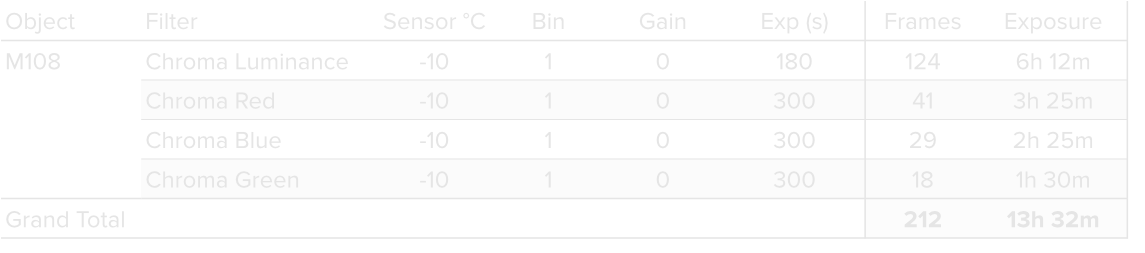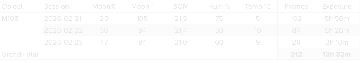 Data was collected during 3 nights in February 2026, using a 14” reflector telescope with full-frame camera at the remote observatory in Spain. Data was gathered using standard LRGB filters. A total of approximately 13 hours of data was finally combined to create the final image.