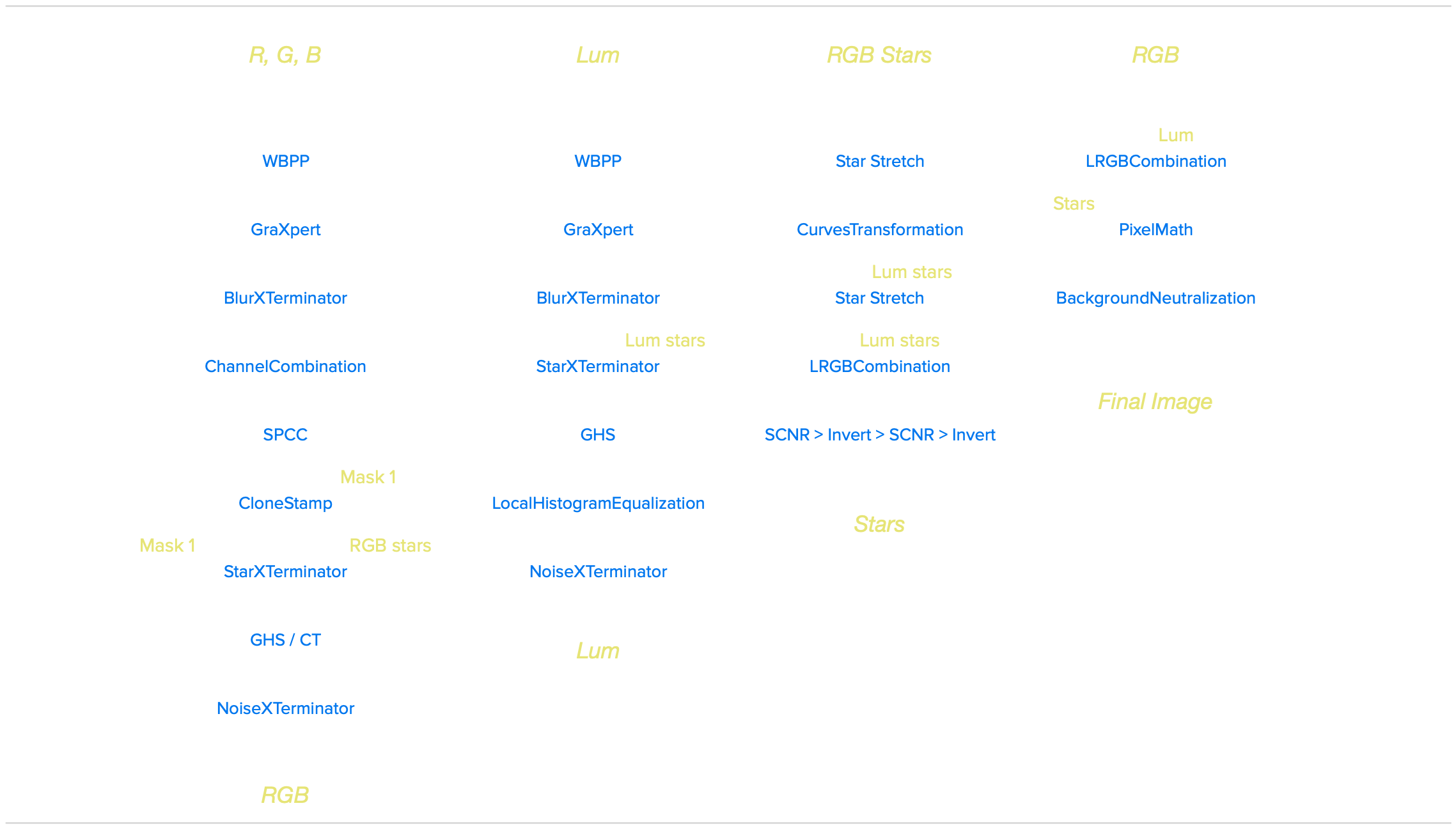 All processing was done in Pixsinsight unless stated otherwise. Default features were enhanced using scripts and tools from RC-Astro, SetiAstro, GraXpert, CosmicPhotons and others. Images were calibrated using 50 Darks, 50 Flats, and 50 Flat-Darks, registered and integrated using WeightedBatchPreProcessing (WBPP). The processing workflow diagram below outlines the steps taken to create the final image.