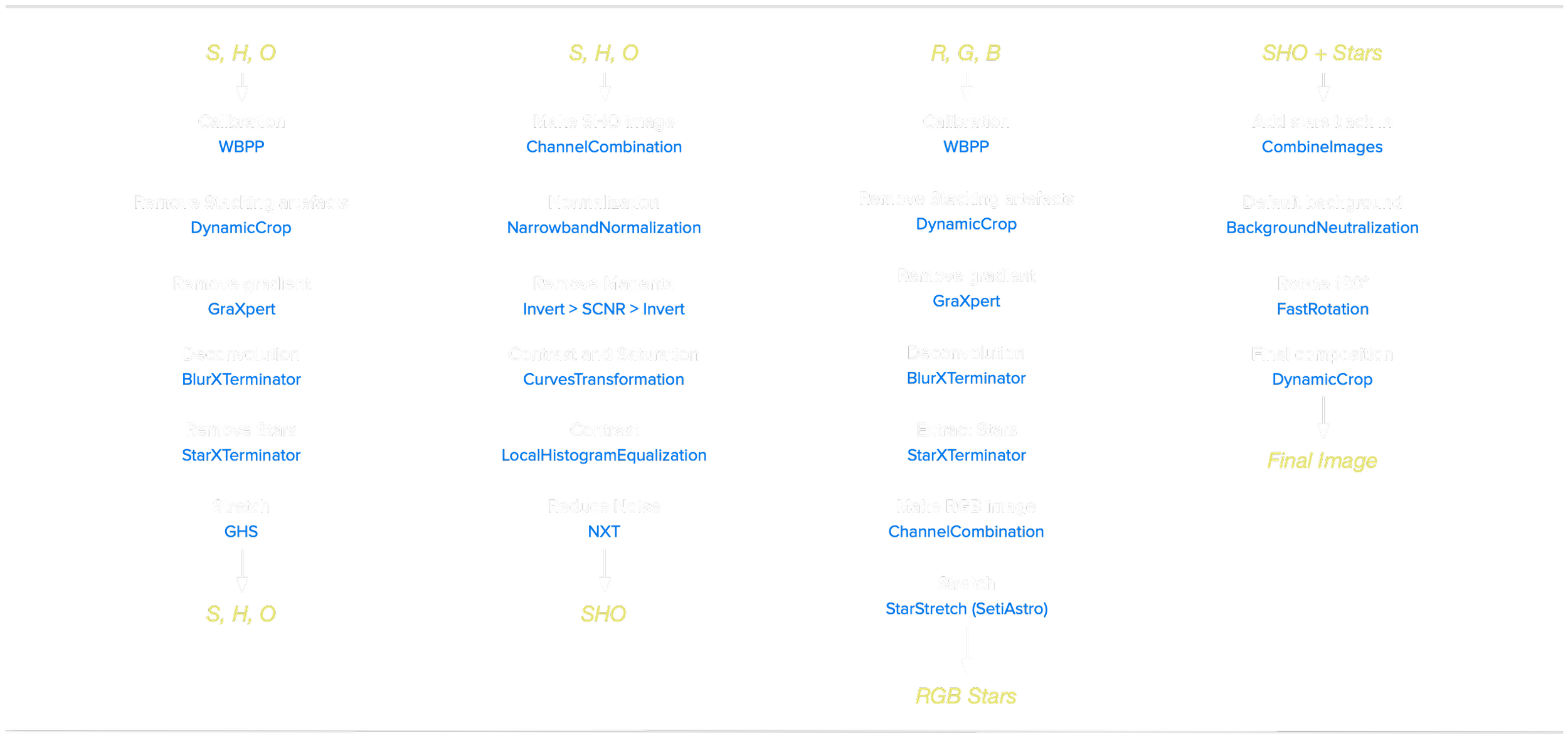 For the stars, the broadband images were gradient corrected (GraXpert), deconvolved (BXT) and stars extracted (SXT). The star-images were put together (ChannelCombination) and stretched using StarStretch (SetiAstro) at default settings.
