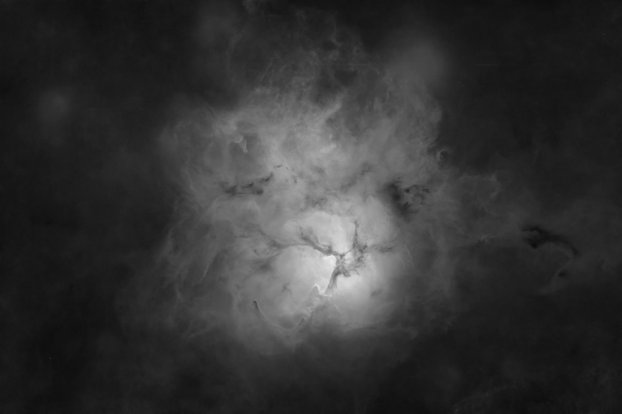 When the image was finalised, the brightness in the center of the nebula was rather high, somewhat obscuring some of the bright stars in the center. While I tried several attempts to selectively lower the brightness in the center and/or reduce star brightness in the center, none of them really gave a pleasing result. In line with earlier experiences, any type of brightness recovery using any kind of masking is very tricky and quickly shows the structure of the mask, making the adjustment unnatural. An alternative might have been to have a full HDR workflow from the beginning, but I decided not to go that route. The bright center of the nebula, albeit obscuring the bright stars a bit, makes for a nice glow in the image, which makes it stand out quite nicely.