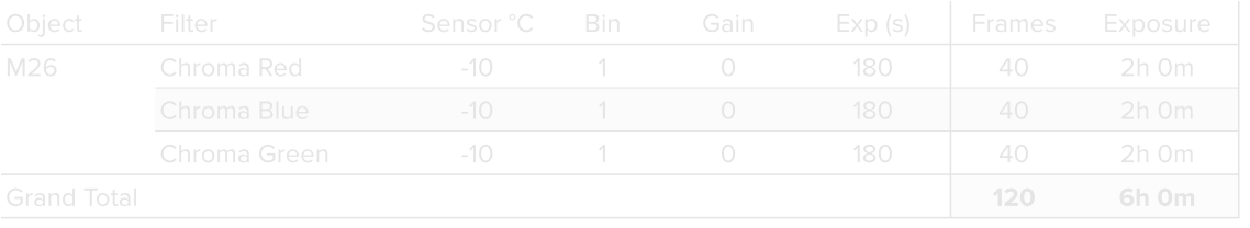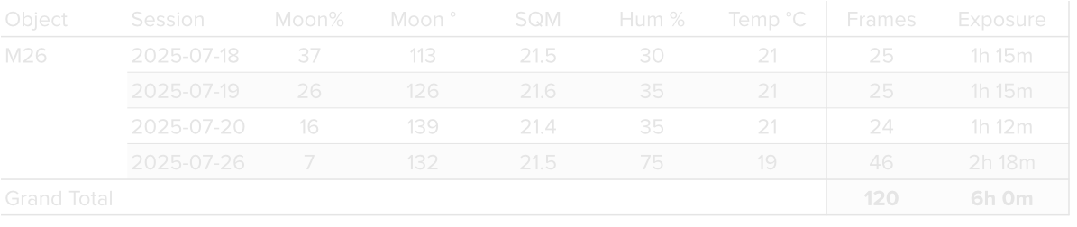 Data was collected over 4 nights in July 2025, using a 14” reflector telescope with full-frame camera at the remote observatory in Spain. Data was gathered using standard RGB filters. A total of approximately 6 hours of data was finally combined to create the final image.