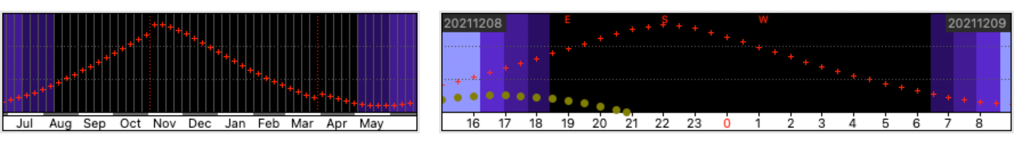 Visibility charts showing 22:00h altitude throughout the year (left) and throughout the session on 08 December, 2021 (right).