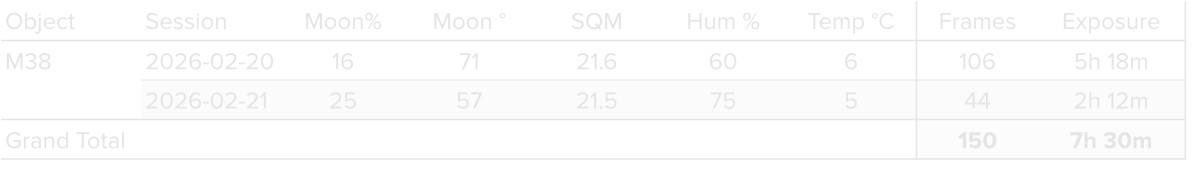 Messier 38, also known as NGC 1912, is an open cluster located in the constellation Auriga, at a distance of approximately 4,200 light-years from Earth. It was first recorded by Guillaume Le Gentil in 1749 and later catalogued by Charles Messier in 1764. The cluster spans around 21 arcminutes on the sky, corresponding to a true diameter of roughly 25 light-years, and has an apparent magnitude of 6.4. The cluster contains around 100 confirmed member stars and is estimated to be approximately 220 million years old. Its most luminous member is a yellow giant of magnitude 7.9, indicating that the most massive stars have already evolved off the main sequence. The brighter stars form a loose oblique or cross-shaped pattern, which gives rise to the informal nickname "the Starfish Cluster." While not visible on this image, the small open cluster NGC 1907 is located roughly half a degree to the south, making it a good target for a ‘double-cluster’. Despite appearing close together in projection, the two clusters are separated by an estimated 2,500 light-years in space. NGC 1907 is considerably older, at around one billion years.