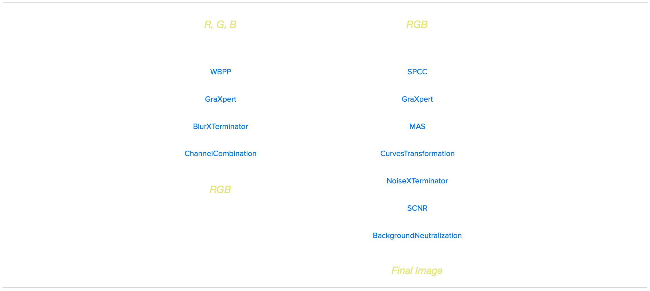 All processing was done in Pixsinsight unless stated otherwise. Default features were enhanced using scripts and tools from RC-Astro, SetiAstro, GraXpert, CosmicPhotons and others. Images were calibrated using 50 Darks, 50 Flats, and 50 Flat-Darks, registered and integrated using WeightedBatchPreProcessing (WBPP). The processing workflow diagram below outlines the steps taken to create the final image.