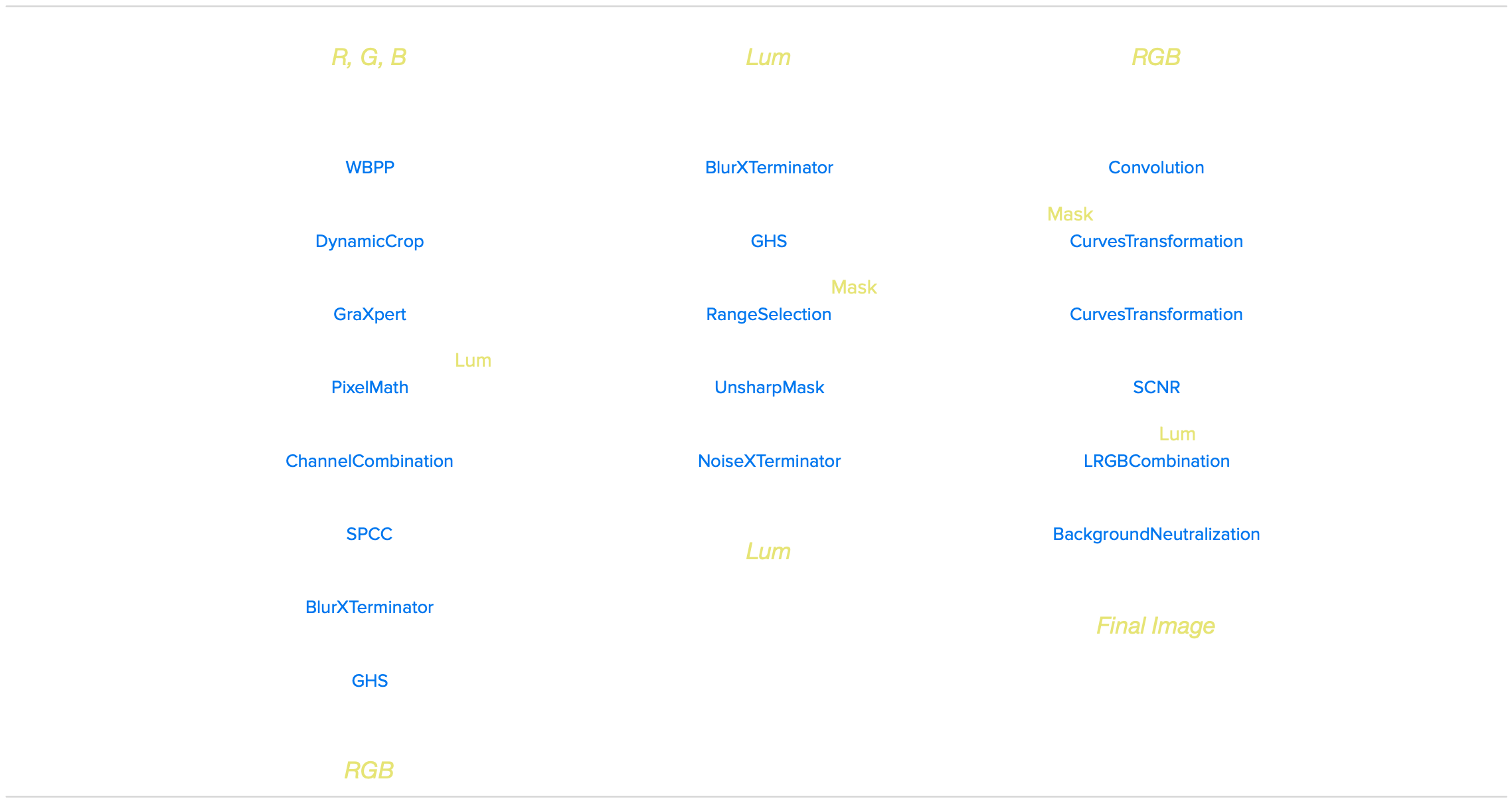 All processing was done in Pixsinsight unless stated otherwise. Default features were enhanced using scripts and tools from RC-Astro, SetiAstro, GraXpert, CosmicPhotons and others. Images were calibrated using 50 Darks, 50 Flats, and 50 Flat-Darks, registered and integrated using WeightedBatchPreProcessing (WBPP). The processing workflow diagram below outlines the steps taken to create the final image.