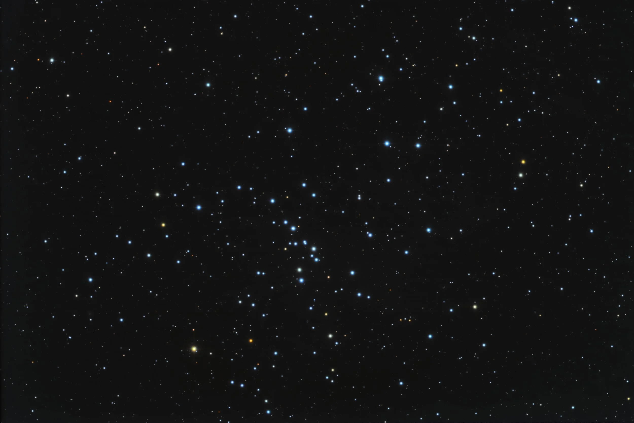 Messier 48, also known as NGC 2548, is a prominent open star cluster located in the constellation Hydra, the Water Snake. It was discovered by the French astronomer Charles Messier in 1771, though there was some initial confusion in its cataloging due to a recording error in its position. This error was later corrected, and M48 was properly identified. The cluster is situated approximately 1,500 light-years from Earth, making it one of the closer open clusters to our solar system. M48 spans about 23 light-years in diameter and contains roughly 80 stars, though some estimates suggest there could be up to 200 stars in the cluster. The stars in M48 are loosely bound by gravity, giving the cluster a somewhat scattered appearance. It is relatively young, with an estimated age of around 300 million years. The cluster is dominated by hot, blue-white main-sequence stars, which are characteristic of younger star clusters. However, it also includes a few evolved stars, such as red giants, which add to its diversity.