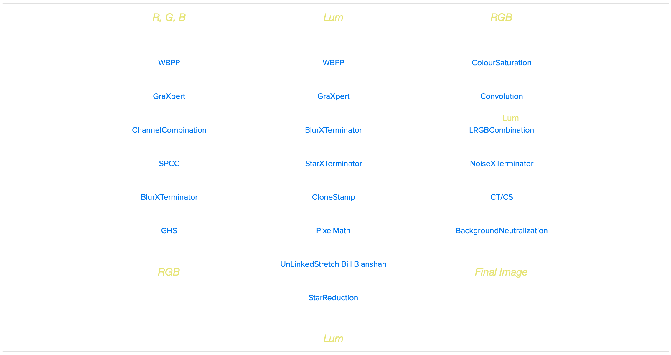 All images were calibrated using Darks (50), Flats (50) and Flat-Darks (50), registered and integrated using the WeightedBatchPreProcessing (WBPP) in PixInsight. All further processing was done in PixInsight, including the use of scripts and tools developed by RC-Astro, SetiAstro, GraXpert, and others. For a step-by-step description of the processing techniques applied, see process flow below.