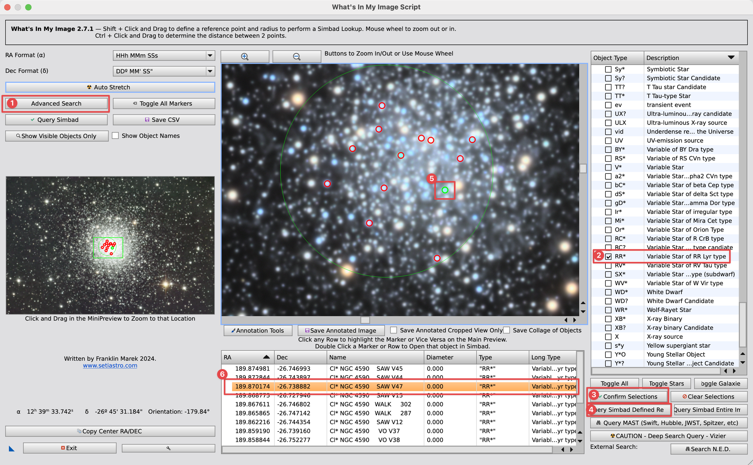 RR Lyrae stars can be identified using the SetiAstro script ‘What’s in my image’. Just load the image in the script, (1) click Advanced Search and (2) select Object Type RR*, with description ‘Variable Star of RR Lyrae type’. (3) Click ‘Confirm Selections’. Shift-click and drag in the image to draw a circle around the area where you suspect the RR Lyrae stars. Then (4) click ‘Query Simbad Defined Region. A list of objects that are found within the search area will now populate under the image. (5) Click the star that you’re interested in, and (6) the associated line-item will highlight. There are a ton of objects that can be identified this way, so always nice to experiment with.
