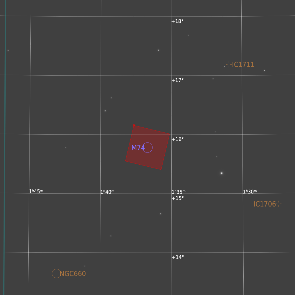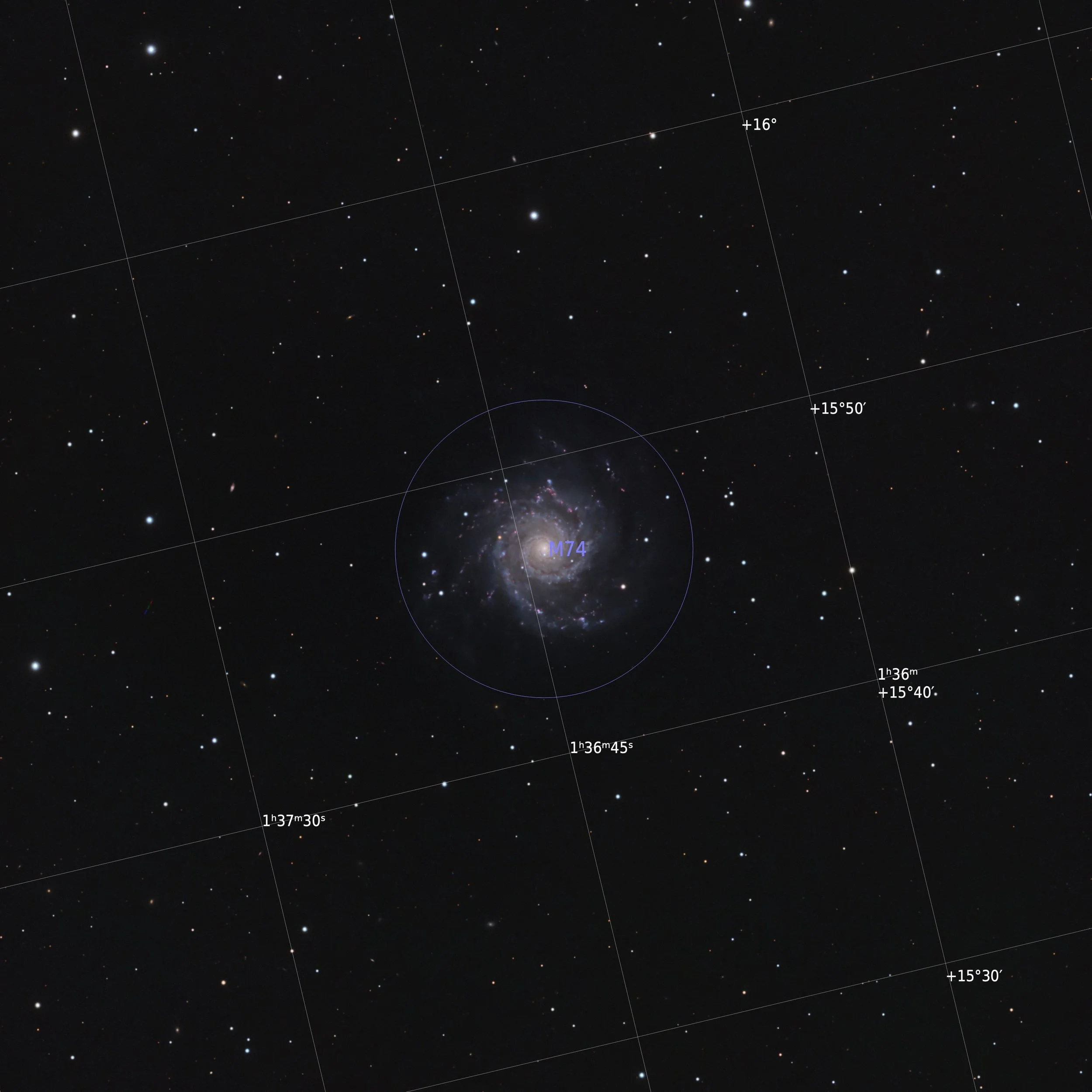 M74 is a difficult target to image. From the Messier list of objects it probably has the lowest surface brightness. A very dark sky and/or a high aperture telescope would be best. For this image, neither was really the case. So the final image is limited in its detail due to these circumstances.