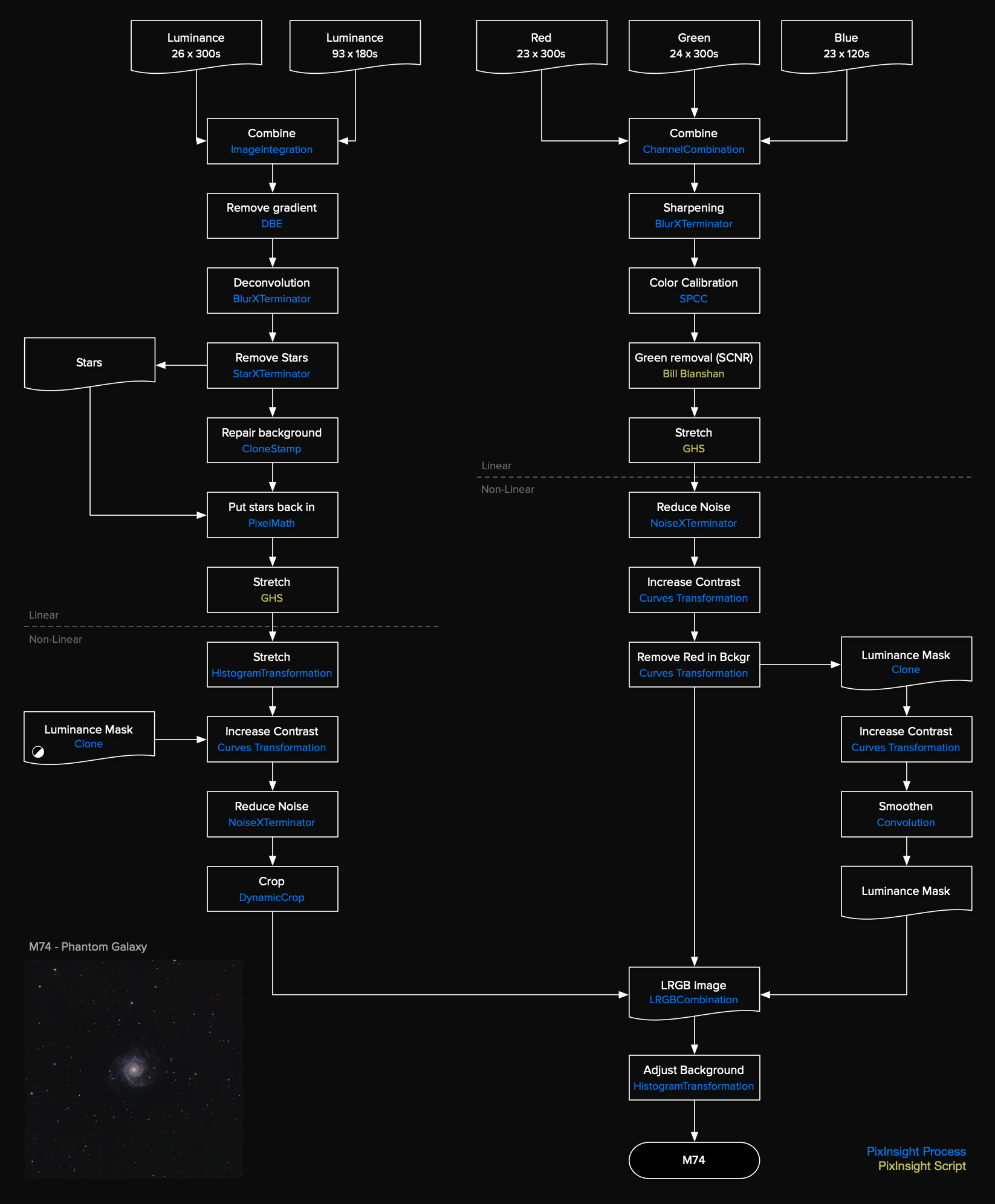 Apart from the flat correction issues described above, the rest of the processing was fairly straightforward, especially using some of the newer tools. Combining ASI1600MM luminance from 2019 with ASI533MM luminance from 2022 was very easy. The WeightedBatchProcessing script had to be fed with the proper Darks and Flats of course, but then it automatically crops and registers the ASI1600 images to a reference image from the ASI533. Since the 2022 luminance data followed an atypical path, both sets had to be manually combined using ImageIntegration. After DBE, the new BlurXTerminator tool was used, but with modest settings (stars 0.3, halos -0.15, non stellar 0.5). Using a combination of GeneralisedHyperbolicStretch (GHS) and HistogramTransformation the image was stretched into its non-linear stage. Contrast was enhanced a little bit, and noise was reduced using NoiseXTerminator (denoise 0.75, detail 0.25).