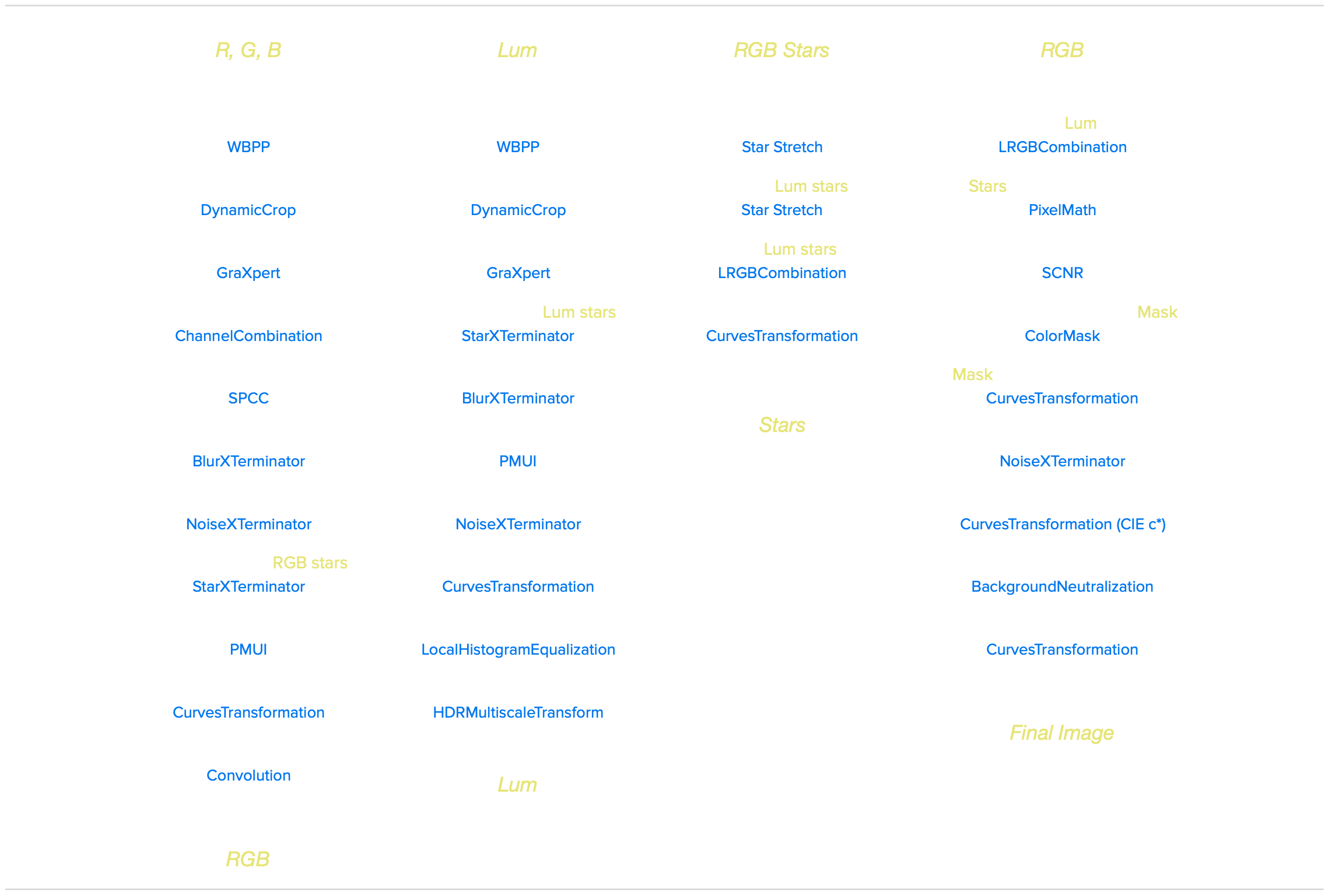 Quite a few extra steps, but the general underlying workflow was fairly similar to other LRGB images, as shown in the diagram below.