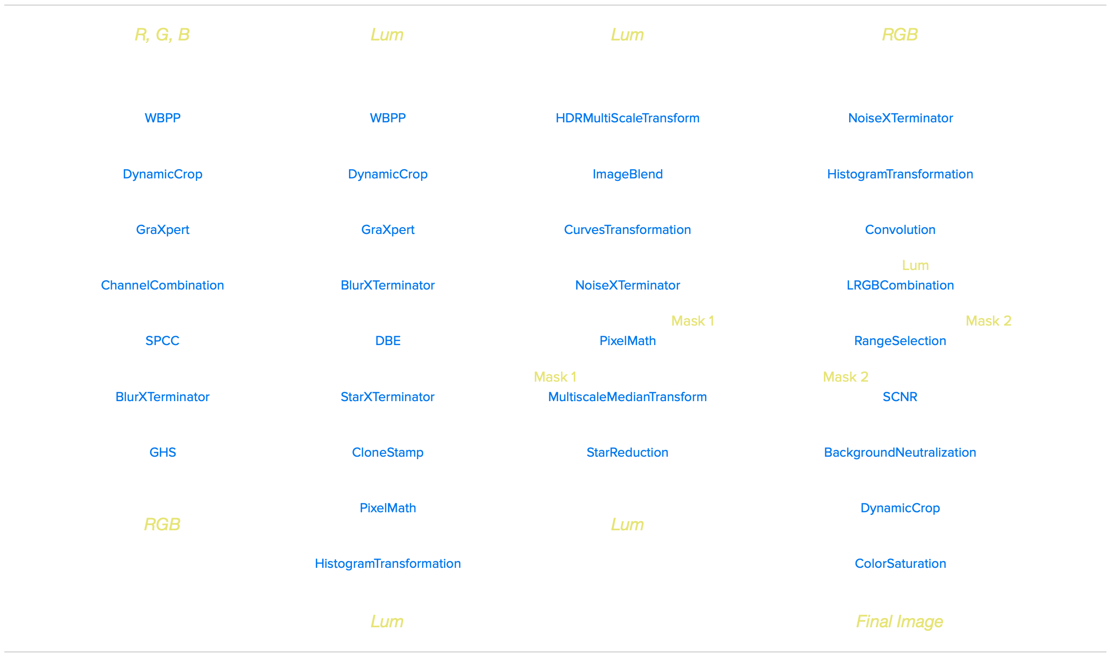 All images were calibrated using Darks (50), Flats (50) and Flat-Darks (50), registered and integrated using the WeightedBatchPreProcessing (WBPP) in PixInsight. All further processing was done in PixInsight, including the use of scripts and tools developed by RC-Astro, SetiAstro, GraXpert, and others. For a step-by-step description of the processing techniques applied, see process flow below.