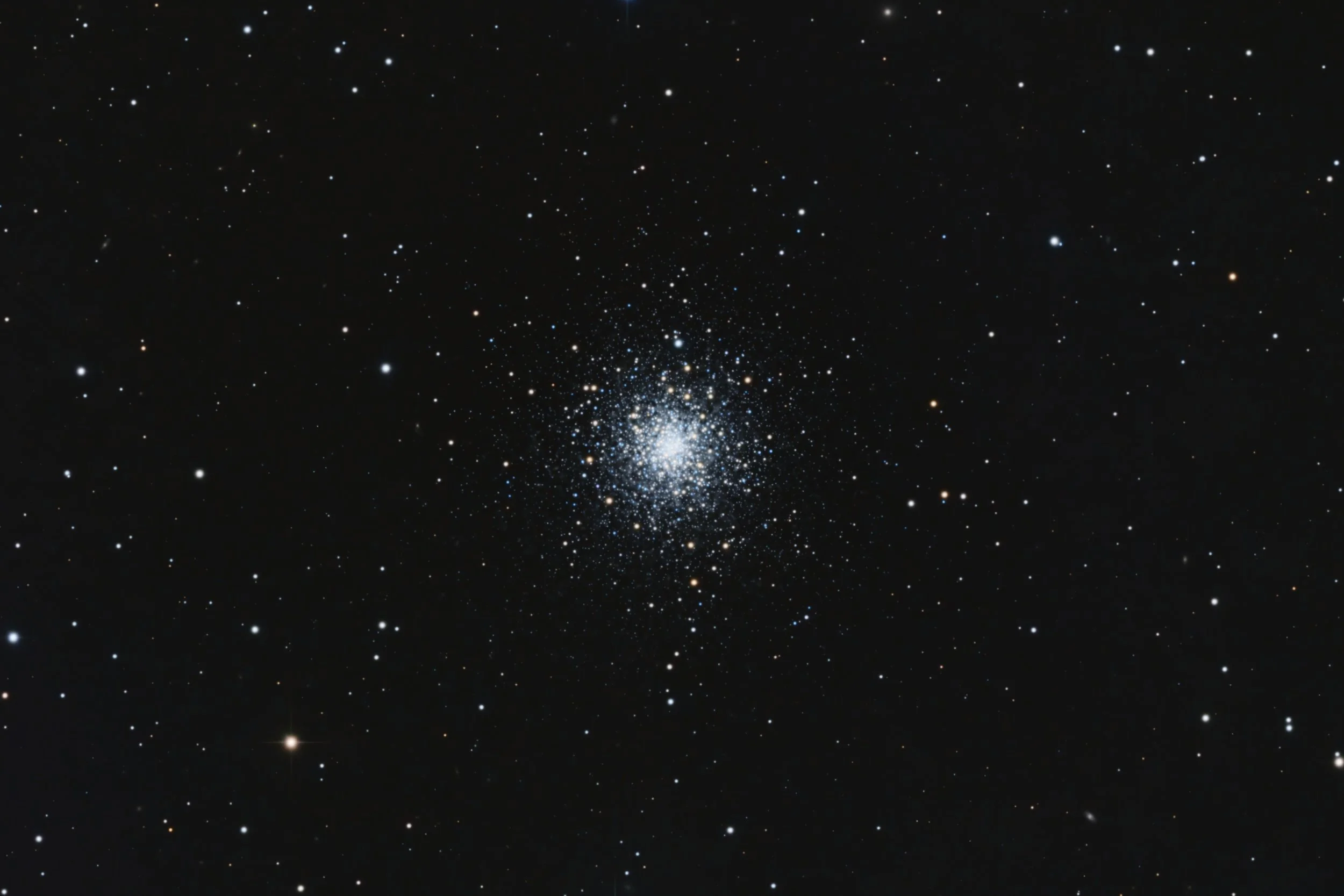 M79 is a small cluster with a bright core. It’s low altitude from the site where this image was taken, made it difficult to retrieve the amount of detail one can otherwise get from a globular cluster. In order to maximise the amount of detail in the core, while at the same time showing all the stars in the dimmer part of the cluster, an HDR technique was applied. There are multiple options for HDR in PixInsight. In this case I chose to create an HDR version of the luminance using HDRMultiScaleTransform. This HDR version was blended with the original in a 50/50 way using ImageBlend.
