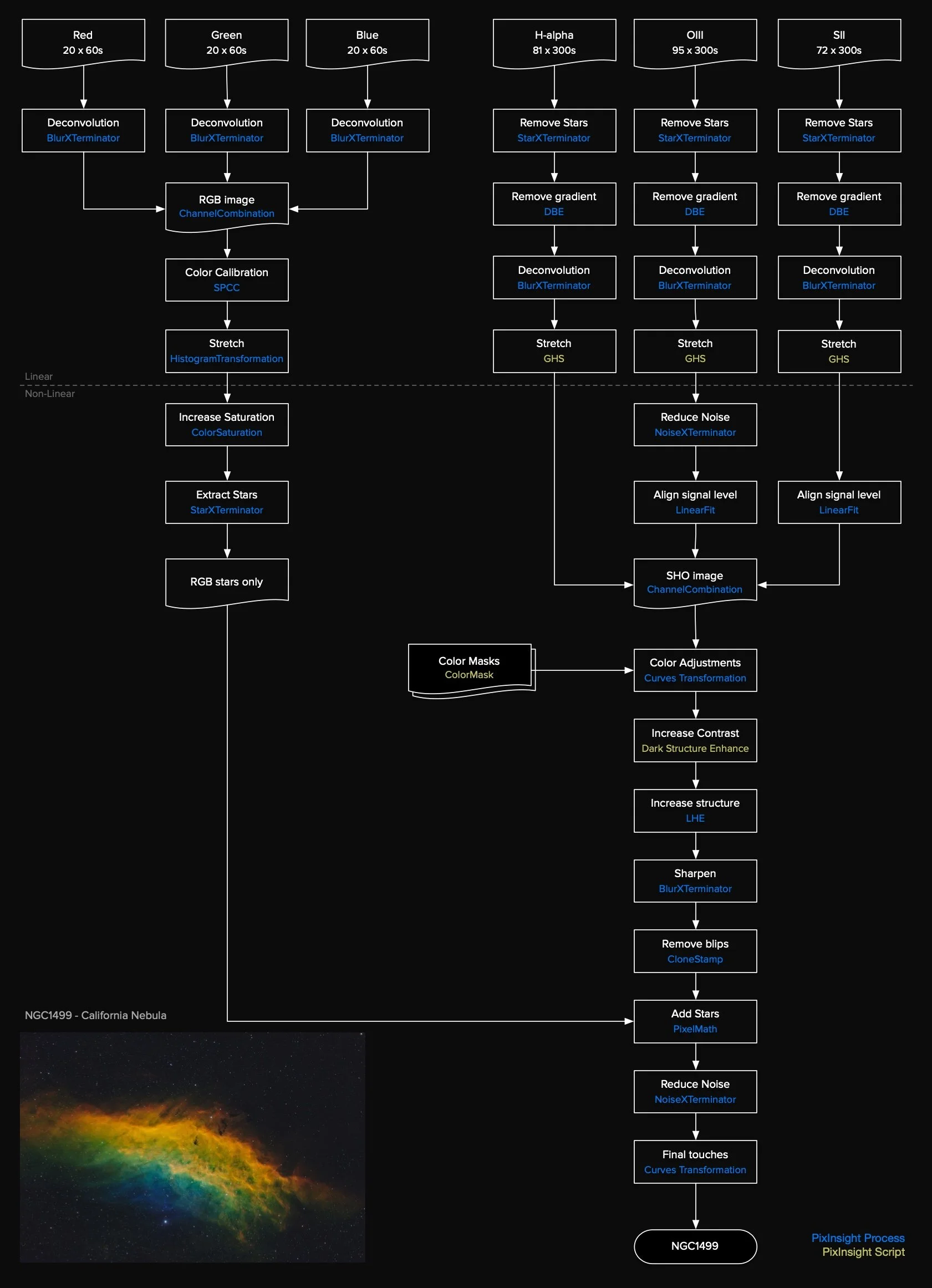 All frames were calibrated with Dark (50), Flat (25) and Flat-Dark (50) frames, registered and integrated using the WeightedBatchPreprocessing script. At the time of taking these images, some experiments were conducted around making Flat frames. As a consequence, Flats were taken with two different Flat panels, one of which did not allow brightness control. So for that panel exposure time was used to get to the target ADU values. Also, some early images were taken at the wrong gain values. Taken together, this resulted in a large variety in exposure times and gain settings, for which all (Flat-)Darks were taken. When putting all of this in WBPP, the complexity of what needed to be calibrated with what was enormous. Nevertheless, WBPP allowed to manage everything in one go. This is a testament for how flexible WBPP is these days. In earlier iterations, such a complex set of calibration combinations would have required multiple runs of the script, each focusing on different images. But now WBPP allows in an easy way very precise targeting of calibration frames to light frames. The early higher gain value narrow band images were combined with the gain 100 images without any problems.
