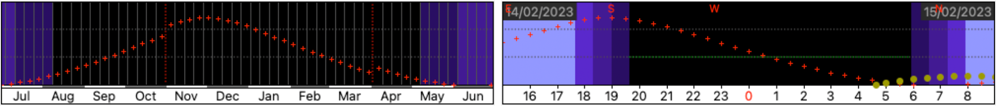 While technically a circumpolar object, NGC1499 can best be considered a winter object, with optimal visibility from October until February. Subs were taken on five nights between 07-14 February 2023. During the early parts of those nights, the object was high above the horizon and could be photographed until just after 01:00h at night. The moon was rising later in the evening during the first sessions, and fully absent during the later sessions. Weather conditions were a bit hit and miss. Humidity was mostly high between 85 and 95% and during several parts of the sessions too much clouds prevented from imaging. So from the 6 hours or so imaging window in each of the nights, several hours were lost due to weather conditions. Temperatures were ok and fluctuated around the freezing point.