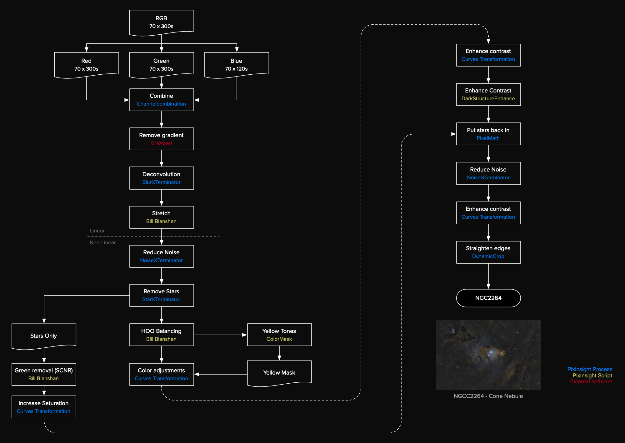 I still have very little experience with processing OSC images. But Bill Blanshan has developed a series of PixelMath scripts that can be of great help in processing OSC images. They are certainly not only usable for OSC, but work well with them. So for the remainder of the processing I used several of his scripts. First is an unlinked stretching script that worked straight out of the box without any further tweaking. The next scripts are designed to work on the colours of the nebulae, and they work best with the stars removed. So StarXterminator was used to take out the stars. Then it was time to run the HOO balancing script from Bill. This does a couple of things. First it scales and normalises the channels, something that for regular SHO processing is done using LinearFit. Then it replaces the blue channel with the green channel. In an OSC camera, there are twice as many green pixels than blue pixels, so the green channel has much lower noise levels. The only colour in those channels is fromOIII and that is right in the middle between green and blue anyway. I used further the OIII boost option in the script and set it to 1.2. The result is a fairly saturated blue color for the OIII regions, that stands out nice against the background. Despite the OIII boost, there were no overexposed areas. For the green channel it blends in a bit of red. By altering one parameter in the script, the amount of red blending can be influenced. Because of this red blending in the green channel, the images take on a little bit of a Hubble SHO look. I used the default HaBlend of 0.6. The khaki/yellowish H-alpha regions were further enhanced with a few CurvesAdjustment tweaks under a yellow color mask. To enhance contrast both an CurvesTransformation S-curve was applied as well as the DarkStructureEnhance script. Now it was time to put the stars back in.