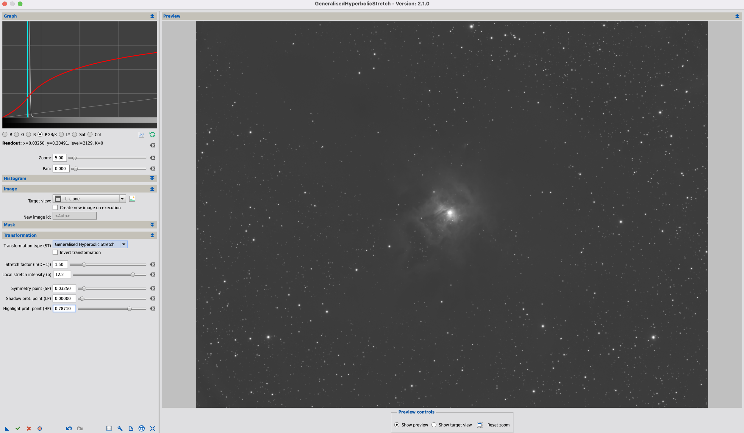 Stretching was done with a completely new method, a script called the Generalised Hyperbolic Stretch (GHS). In regular stretching tools such as HistogramTransformation, the midpoint is moved, always creating the same type of hyperbolic curve. In the GHS script, there is much more control over the shape of the hyperbolic (so not hyperbolic anymore) curve. A symmetry point can be set at the brightness value where most contrast is required. Highlights can be better protected by flattening the right part of the curve. Contrast in dark areas can be maintained by flattening the curve between black point and symmetry point. There is a colour stretch option that much better maintains the colours in the image. Besides the new GHS technique, also familiar stretching techniques such as HistogramTransformation and ArcsinhStretch are available in the tool, both benefiting from some of the enhanced control as explained above.