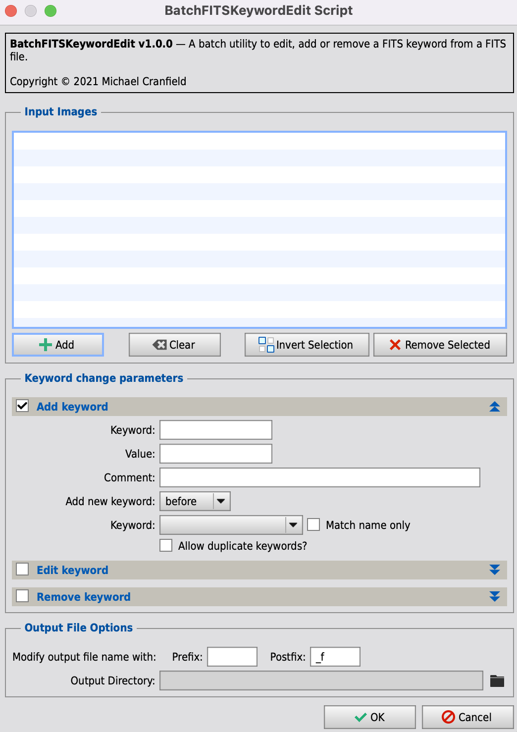 Flats were taken after the sessions, and also after an upgrade of KStars/Ekos to version 3.5.7. Unfortunately this new version does not always reliably write the FILTER keyword used in the FITS header. And without that keyword, WBPP does not know how to match the various frames. After some searching a workaround was found. The BatchFITSKeywordEdit script allows for bulk adding and changing keywords in PI. A very valuable tool.
