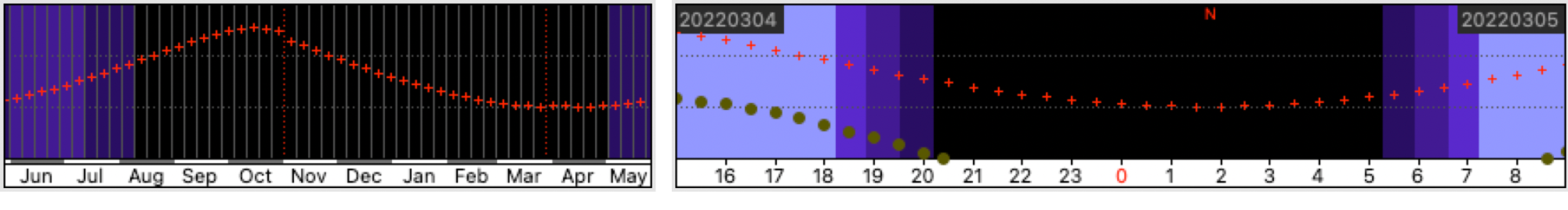 Visibility charts showing 22:00h altitude throughout the year (left) and throughout the session on March 04, 2022 (right).