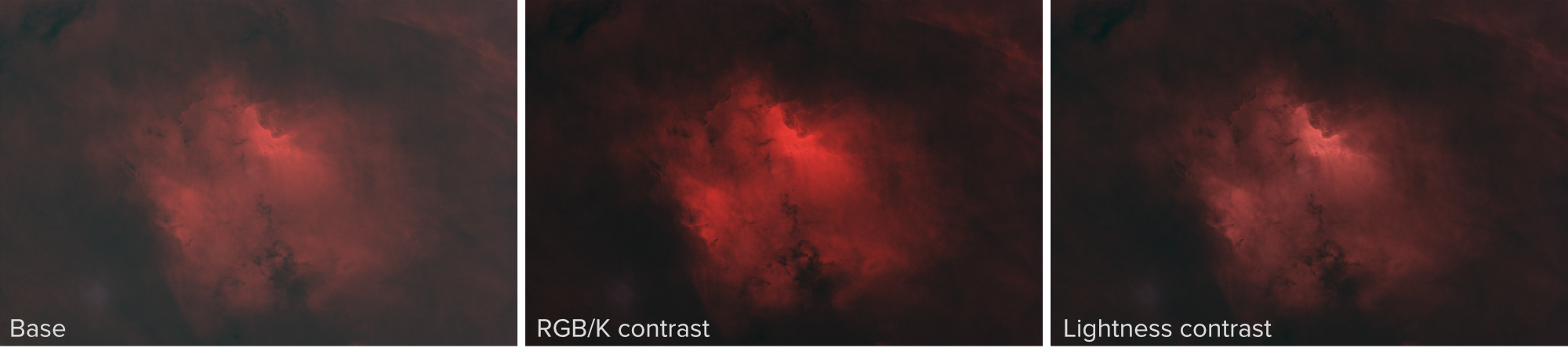 When adding contrast to an Ha-image by applying an S-curve, be aware of the differences between the RGB/K and the Lightness channels. The former quickly leads to an over-saturated image and lost detail, while the latter keeps a lot more of the detail and overall has a more pleasing look.
