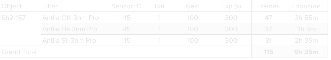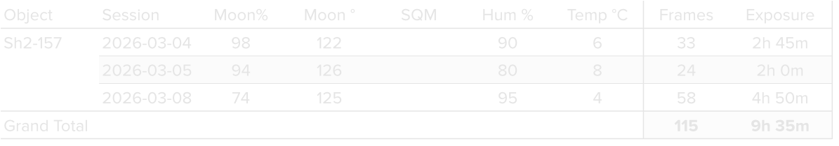Data was collected over 3 nights in early March2026 130mm refractor telescope with full-frame camera from the backyard in The Netherlands. Data were gathered in narrowband using Ha, OIII and SII filters with the intention to create a Hubble palette. No additional RGB data was collected for the stars. Several frames were lost due to some trees that were in the way around midnight. Autumn is a better time to photograph this object, but clear skies gaves an opportunity to photograph under unfavourable moonlight conditions, so a suitable narrowband object was chosen. A total of about 9 hours of data was combined to create the final image.