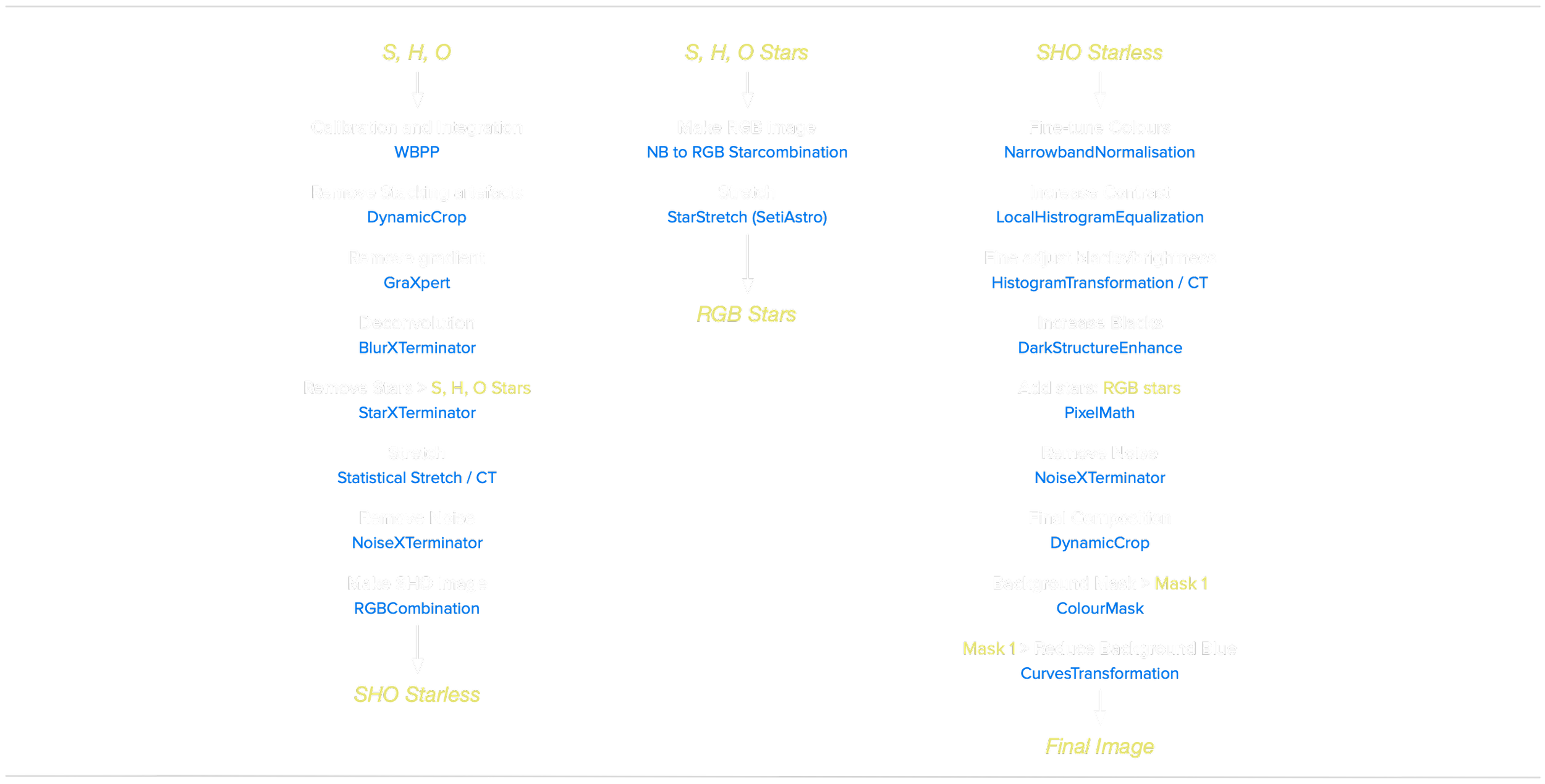 All processing was done in Pixsinsight unless stated otherwise. Default features were enhanced using scripts and tools from RC-Astro, SetiAstro, GraXpert and others. Images were calibrated using 50 Darks, 50 Flats, and 50 Flat-Darks, registered, integrated and drizzled (2x) using WeightedBatchPreProcessing (WBPP). The processing workflow diagram below outlines the steps taken to create the final image.