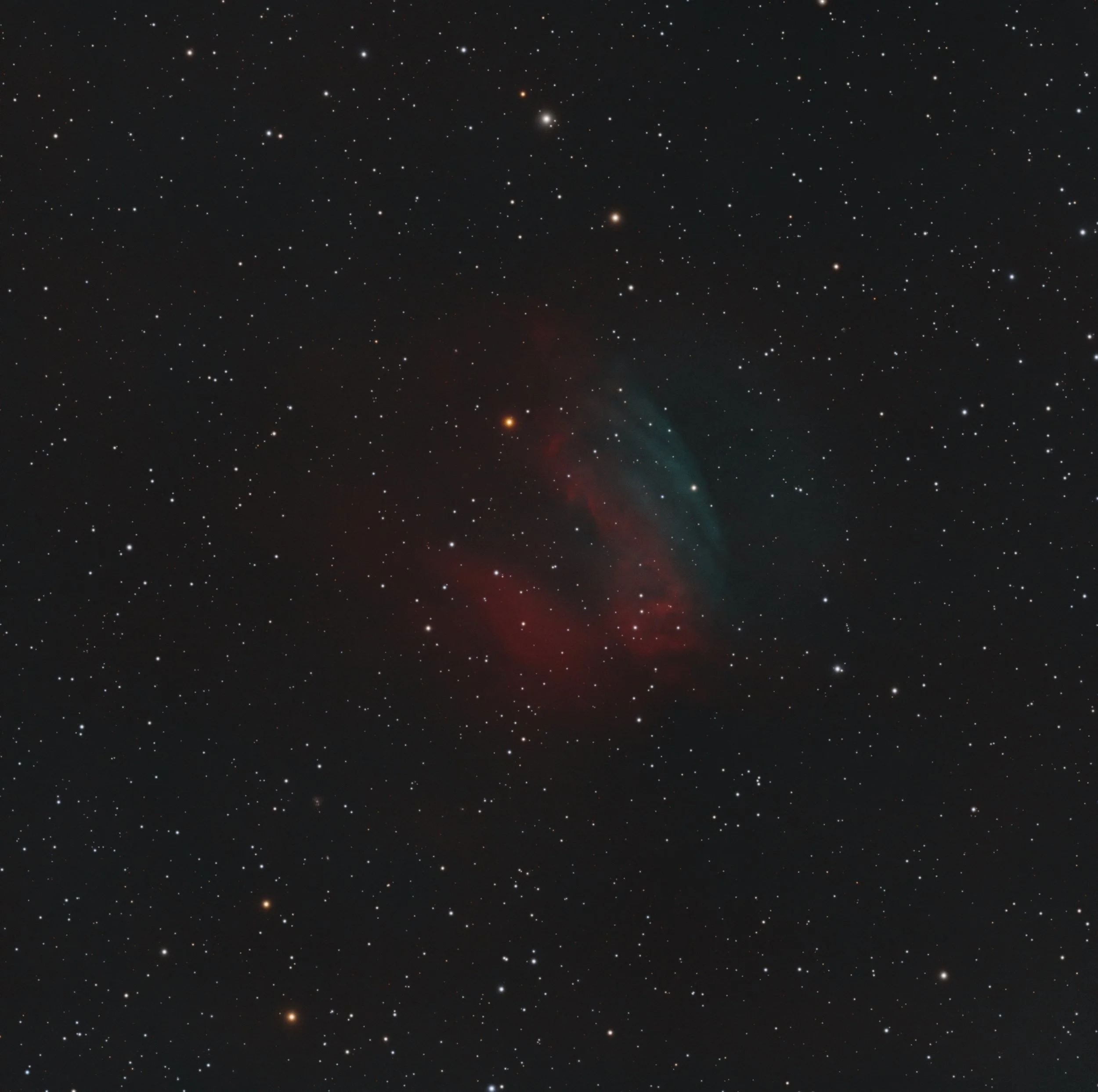 There is not a whole lot of detail in this very fain nebula, and noise reduction was pretty much the only further processing that was done before the stars were put back in. Interestingly, the stars generated by the Foraxx PixelMath script were more natural looking. Both the red and blue stars had a nicer, more natural colour than stars in an HOO palette. So the ‘Foraxx stars’ were put back into the nebula, using the screening function. Just a little contrast enhancement using CurvesTransformation was all that was applied for the final image.