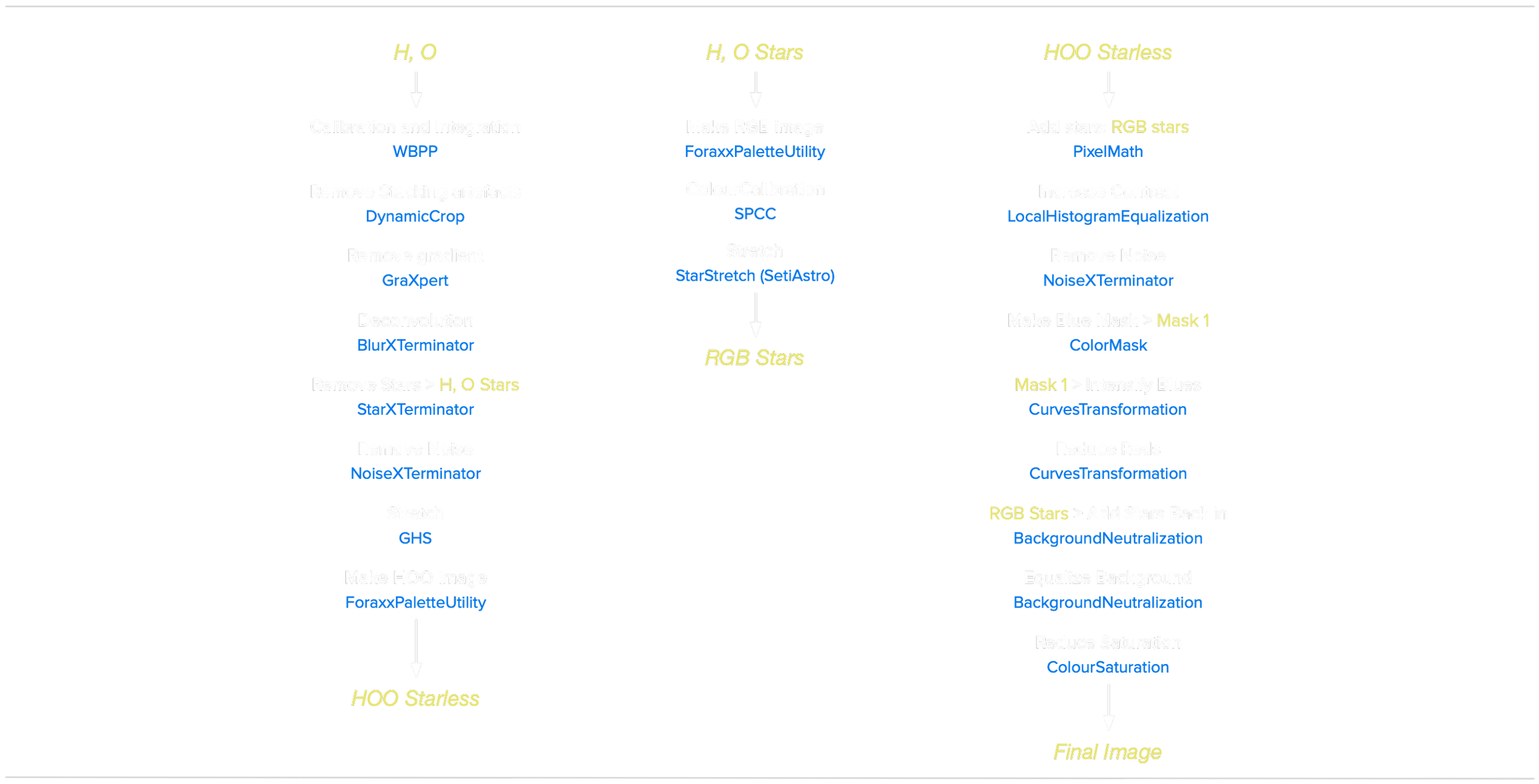 All images were calibrated using Darks (50), Flats (50) and Flat-Darks (50), registered and integrated using the WeightedBatchPreProcessing (WBPP) in PixInsight. All further processing was done in PixInsight, including the use of scripts and tools developed by RC-Astro, SetiAstro, GraXpert, and others. For a step-by-step description of the processing techniques applied, see process flow below.