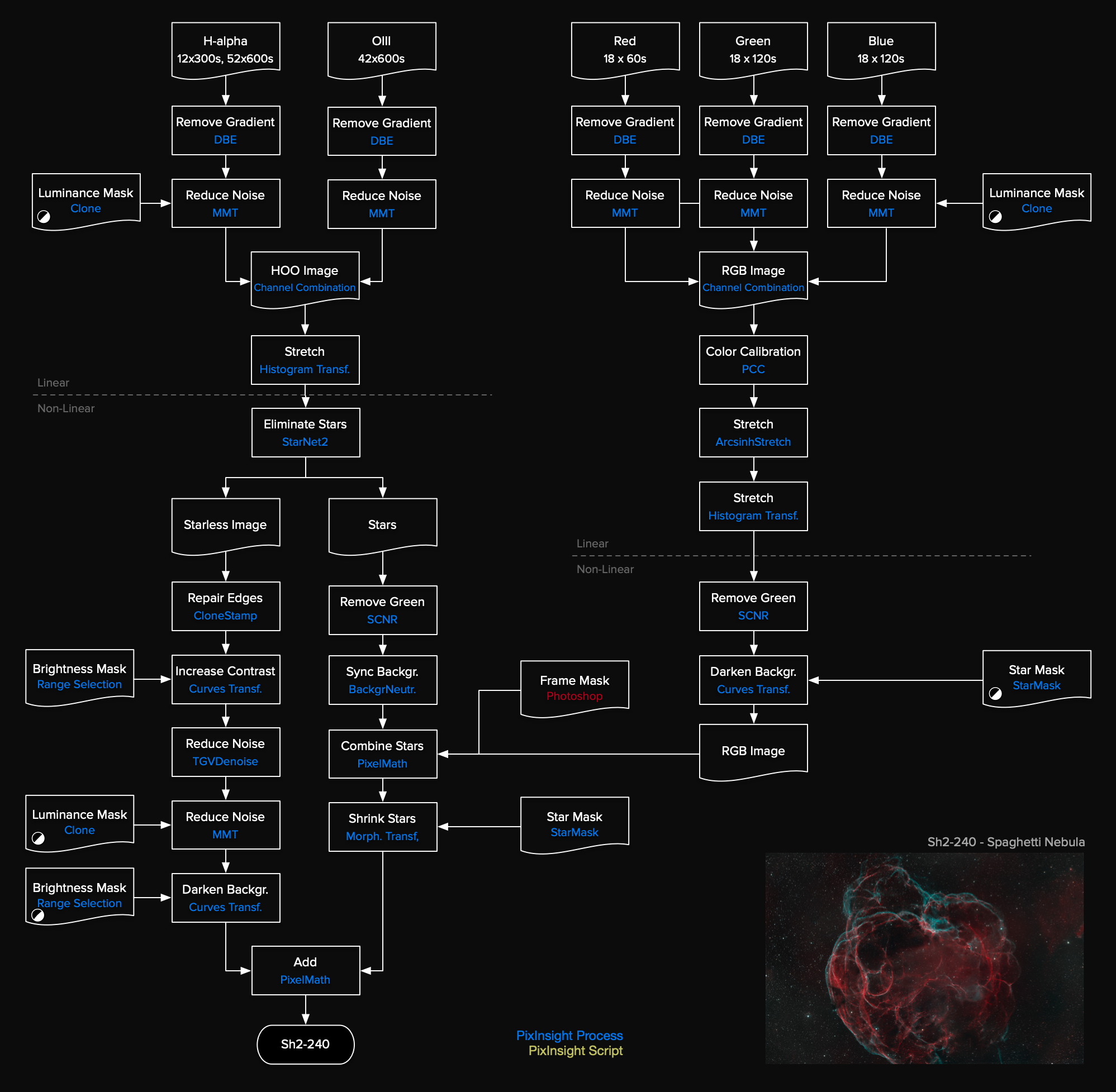 Calibrating the frames was fairly straightforward. Flat frames were calibrated with Bias (100) and Light frames were calibrated with Dark (50) and Flat (25) frames and registered using the WeightedBatchPreprocessing script. Image frames were normalized and scaled using the NormalizeScaleGradient script and integrated using NSG parameters.