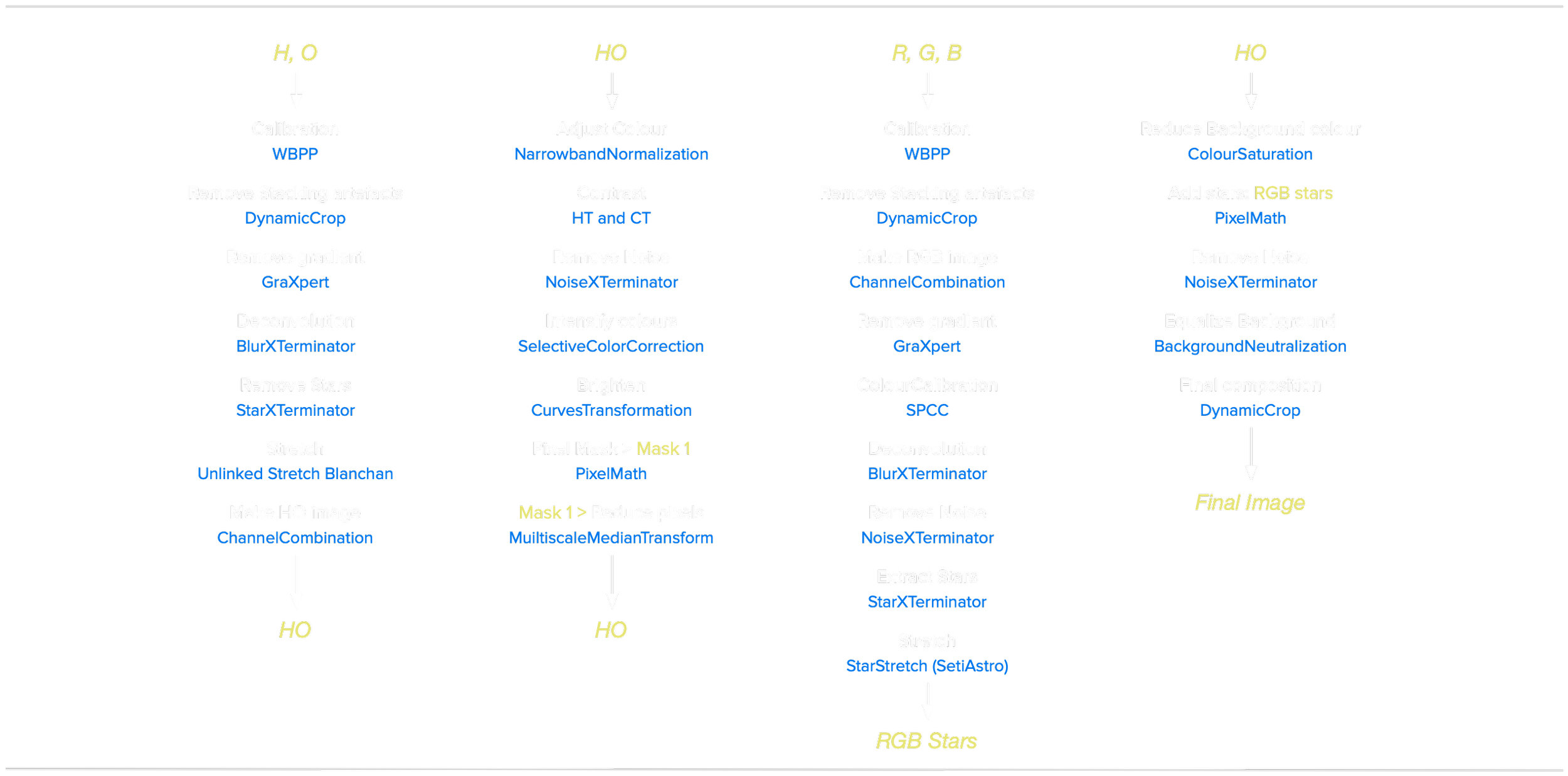 All images were calibrated using Darks (50), Flats (50) and Flat-Darks (50), registered and integrated using the WeightedBatchPreProcessing (WBPP) in PixInsight. All further processing was done in PixInsight, including the use of scripts and tools developed by RC-Astro, SetiAstro, GraXpert, and others. For a step-by-step description of the processing techniques applied, see process flow below.