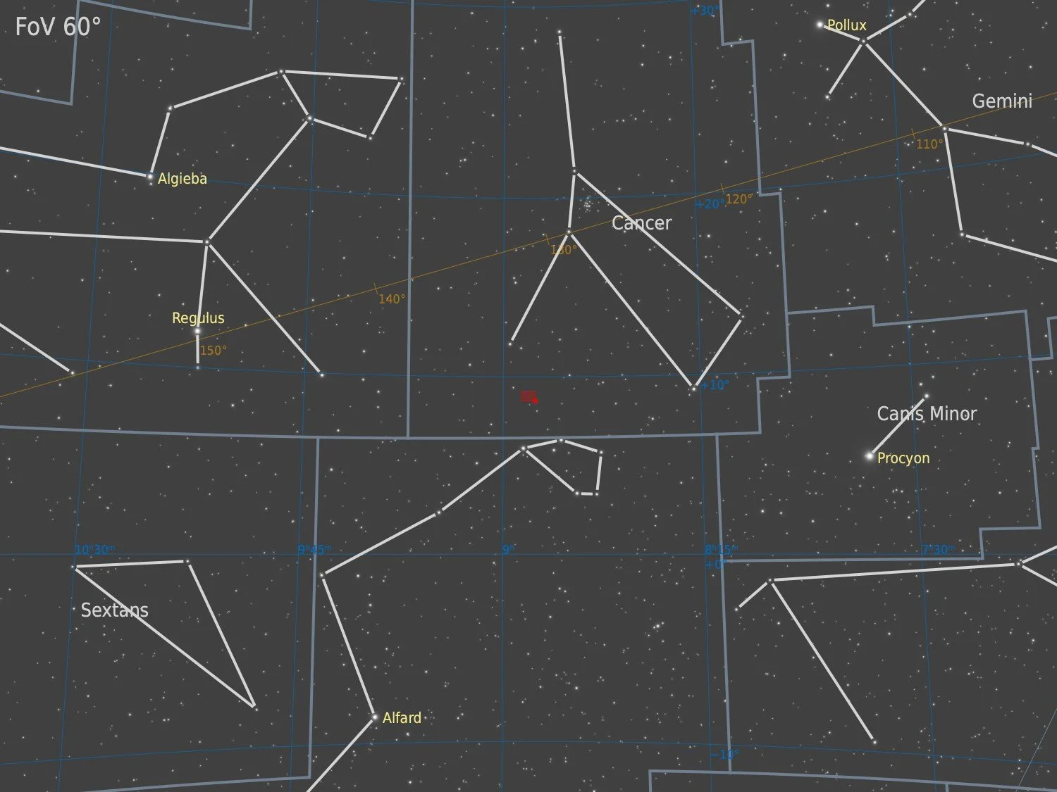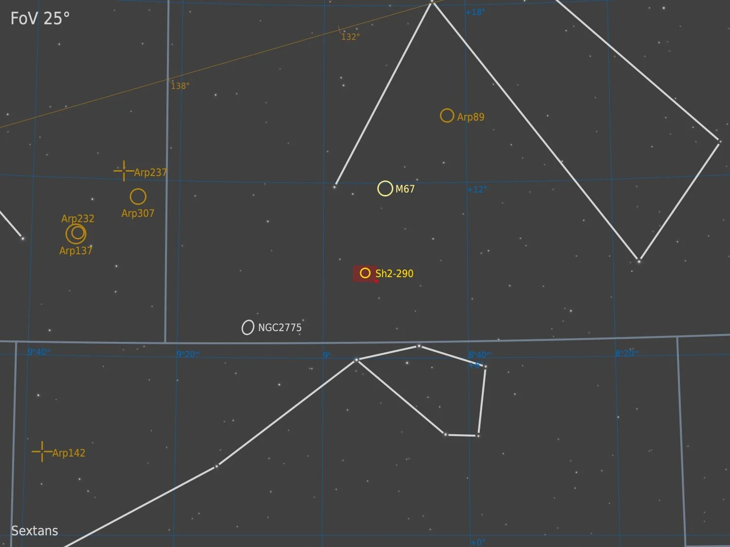 Sh2-290 ( also known as Abell 31) is an ancient planetary nebula in the constellation of Cancer. It is estimated to be about 2,000 light years away. Although it is one of the largest planetary nebulae in the sky, it is not very bright. The central star of the planetary nebula is a white dwarf with a spectral type of DAO. The white dwarf is the dead remains of a star that existed but had died leaving behind Sh2-290 and the white dwarf. Sh2-290 is made mostly of hydrogen and oxygen gas. The nebula has a blue central region being most of the nebula and a red ring around this blue region. The nebula due to its ancient age has its gas being dispersed into the interstellar medium. Some nearby objects include the Beehive Cluster (a cluster of about 1000 stars), IC 523 (a galaxy), NGC 2731 (a spiral galaxy) and M 67 (an old cluster of stars sometimes known as the King cobra cluster).