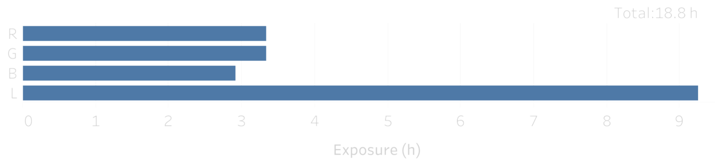 From an imaging standpoint, not much special happened here. Standard settings were used for this broadband imaging. That includes 5min subs for the three colours and 3min for the luminance. Across the three sessions, almost 19h of data was collected, which is quite unique for the backyard observatory.