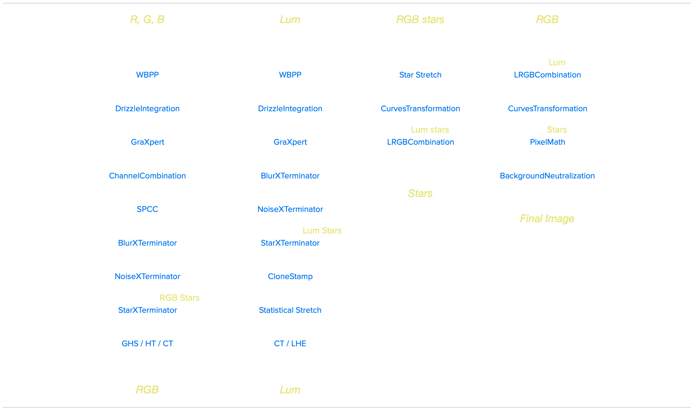 All images were calibrated using Darks (50), Flats (50) and Flat-Darks (50), registered and integrated using the WeightedBatchPreProcessing (WBPP) in PixInsight. All further processing was done in PixInsight, including the use of scripts and tools developed by RC-Astro, SetiAstro, GraXpert, and others. For a step-by-step description of the processing techniques applied, see process flow below.