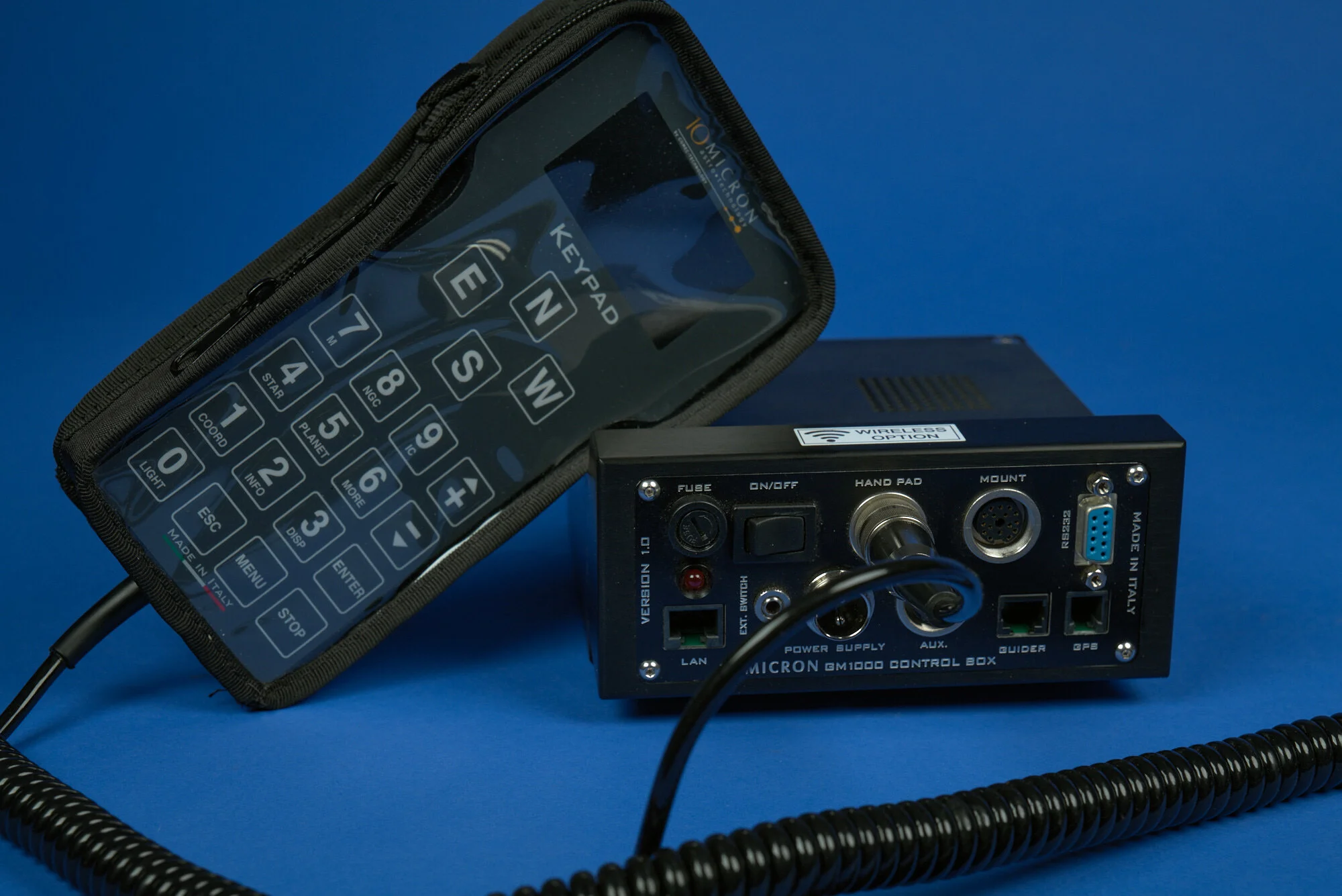 With the mount comes a separate control-box. It is essentially a small linux-based computer that manages all functions of the mount. The control-box can be accessed through an ethernet-cable or WiFi for remote control. Local control works through a hand pad. Don’t expect too great of a user experience from a four-line display, but it works well.